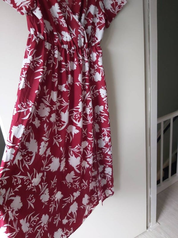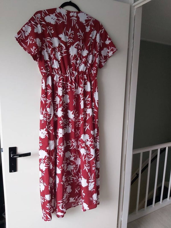 Zo goed als nieuw, prachtige lange zomerjurk rood met wit, een must have voor elke vrouw, de kleur van de liefde. Deze jurk komt tot aan de enkels heeft lorte mouwen en een vhals, en een elastische taille band van blind elastiek maat L 40/42 merk Hapsha