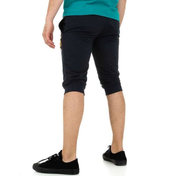 Deze donkerblauw heren korte broek is aansluitend en heeft een grijs bovenstuk en aan de linkerzijkant gele opdruk 86, met insteek broekzakken Deze korte broek heeft elastische banden met veter aanrijgkoord, valt onder de knieen en sluit ook hier goed aan, dankzij elastische banden. Materiaal: 65% katoen, 35% polyester maat L valt 1 maat kleiner als maat M afmetingen plat gemeten: taille rekbaar 33-48cm heup 53cm lengte 63cm. Merk: Nanqier