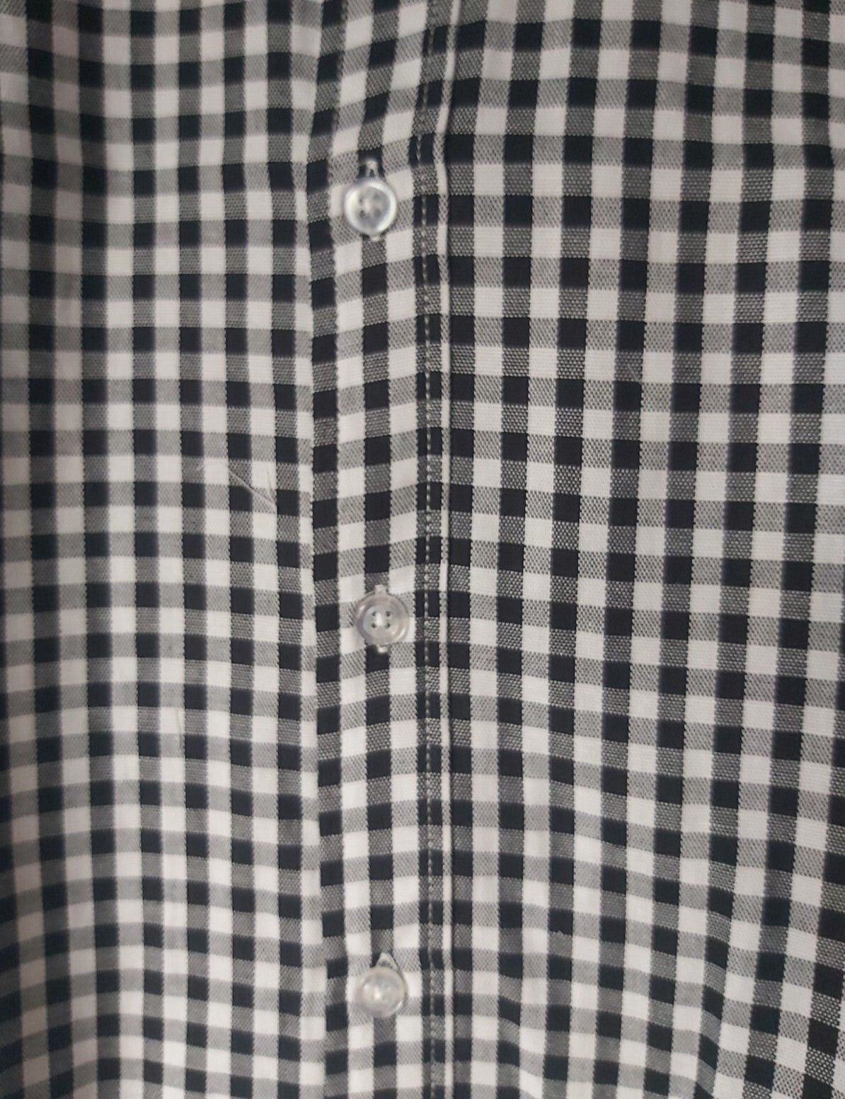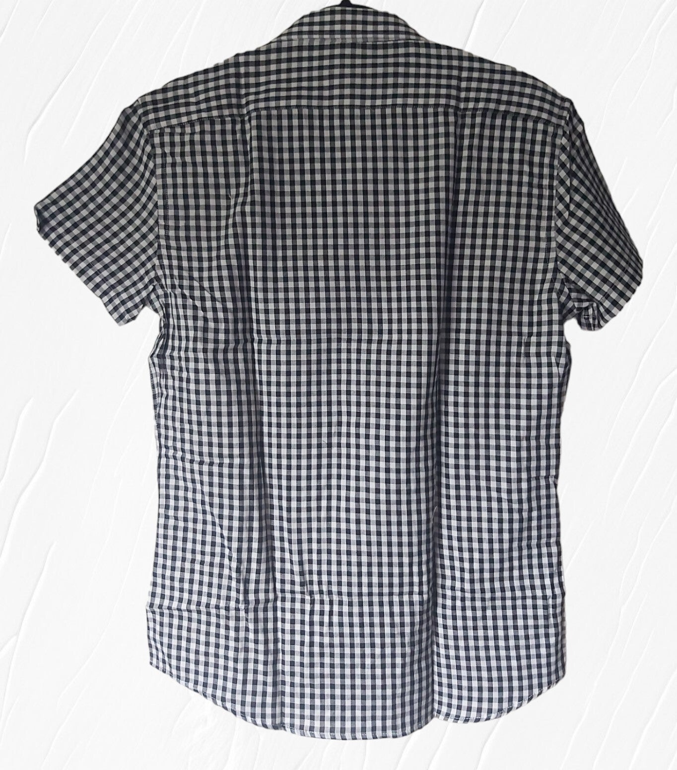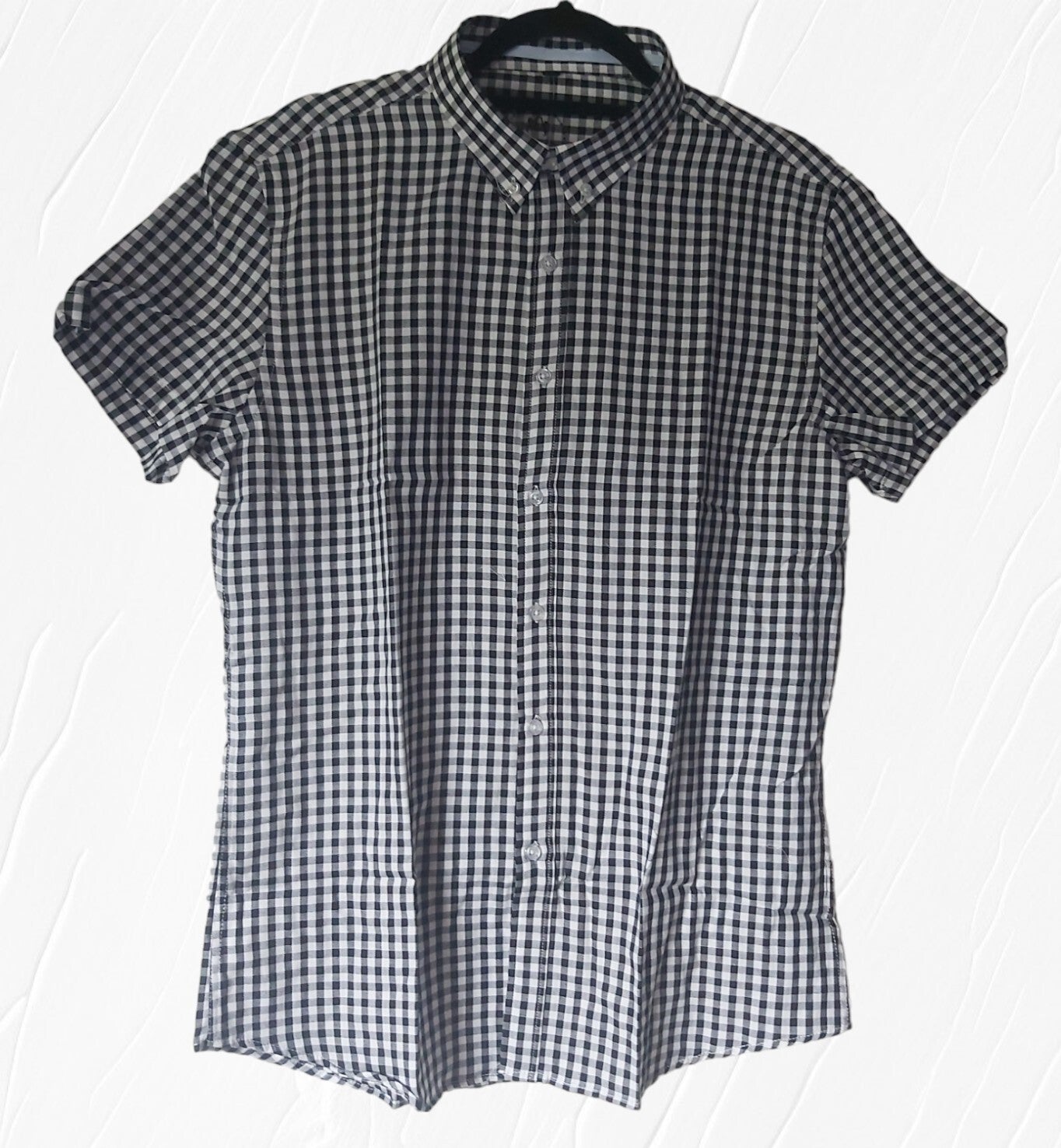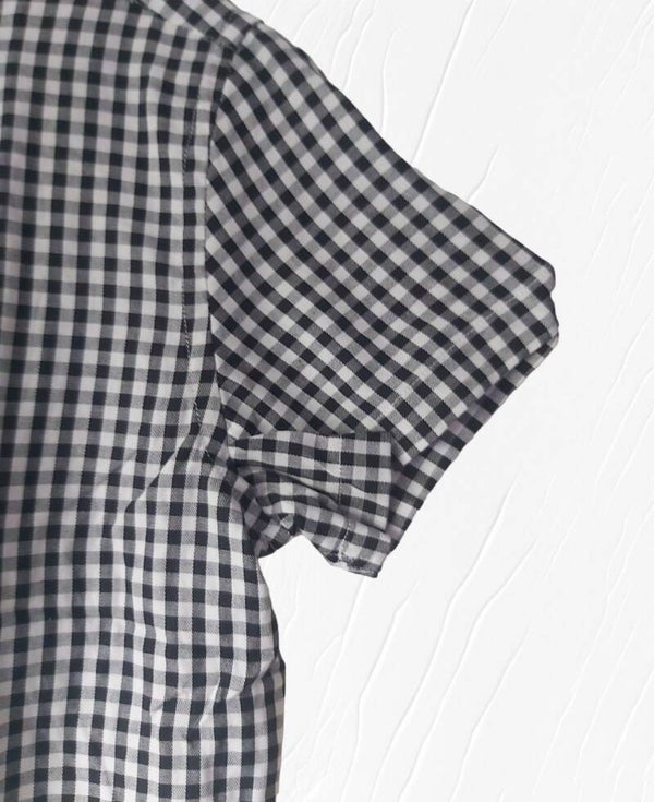 Bekijk de maatindicatie heren overhemd met verfijnd klein ruitpatroon kleuren zwart wit. Met witte knoopjes en korte mouwen. 100% katoen maat L plat gemeten: oksel 56,5cm schouder 47.5cm lengte 74cm