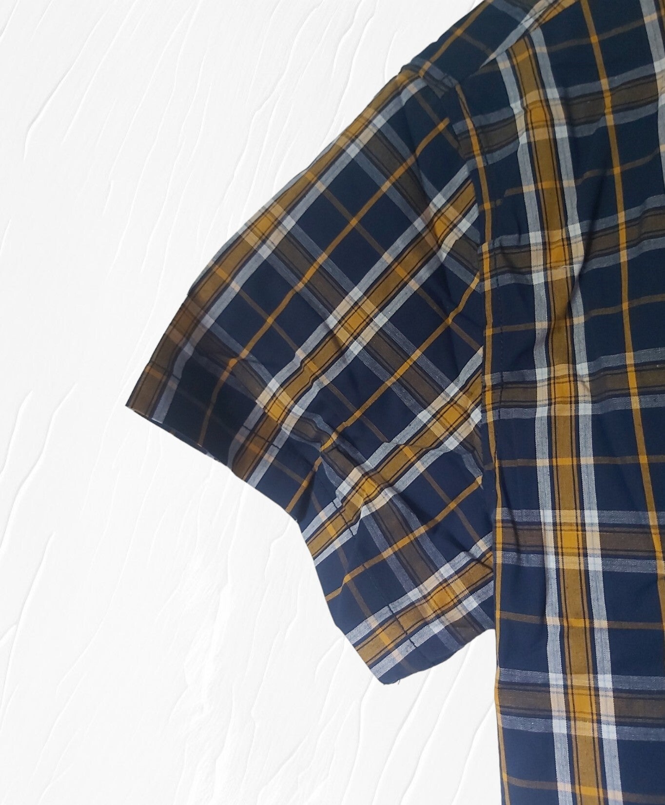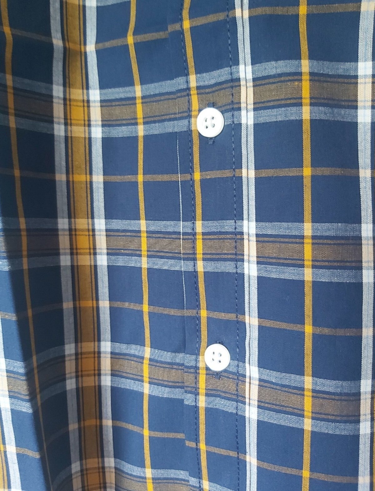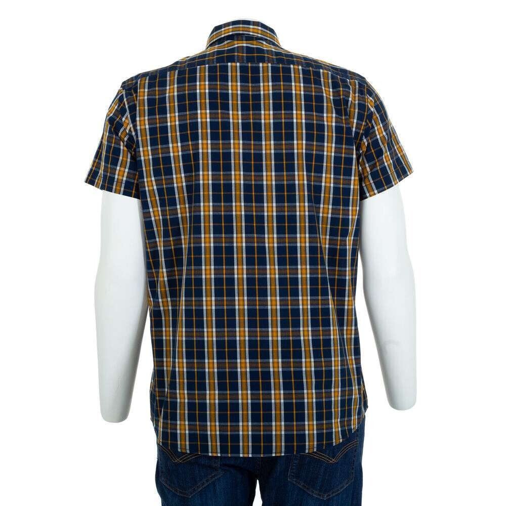 Bekijk de maatindicatie heren overhemd met ruitpatroon kleuren blauw geel wit. Met witte knoopjes en korte mouwen. 100% katoen maat L plat gemeten: oksel 59cm schouder 49,5cm lengte 78,5cm