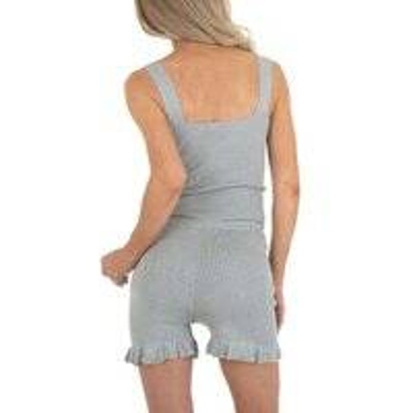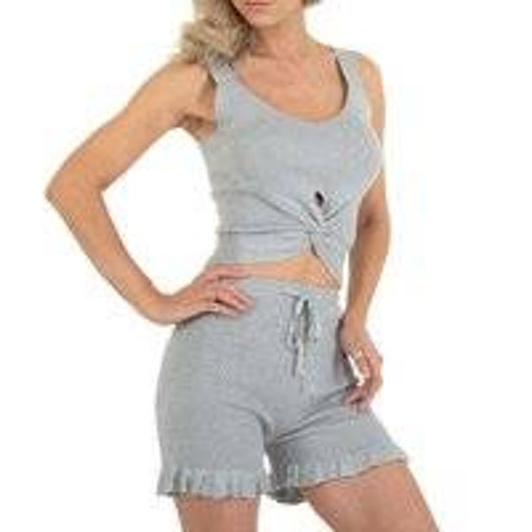 nieuw. Heerlijke zomer set grijs met comfortable stretch voor juiste pasvorm. top gekruist en aan de voorkant iets korter, met brede schouderbanden en korte broek met sierlijk randje en aanrijgkoordjes Material: 70% Viskose, 20% Baumwolle, 10% Elasthan/Spandex. maat S/M. merk: Emma&Ashley