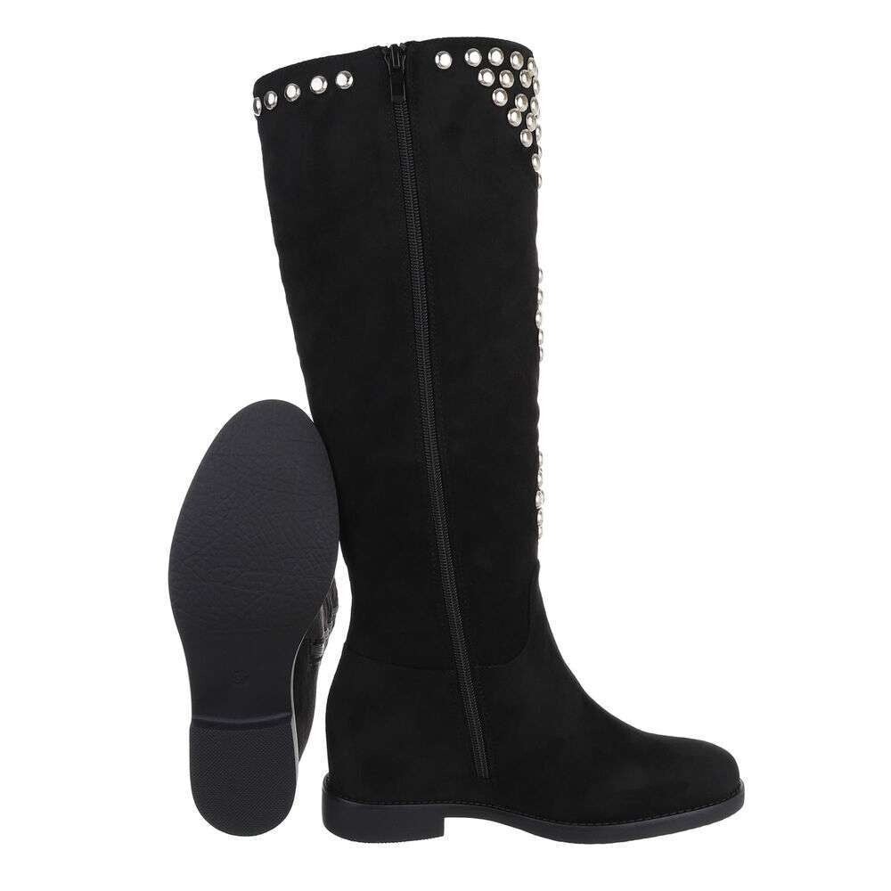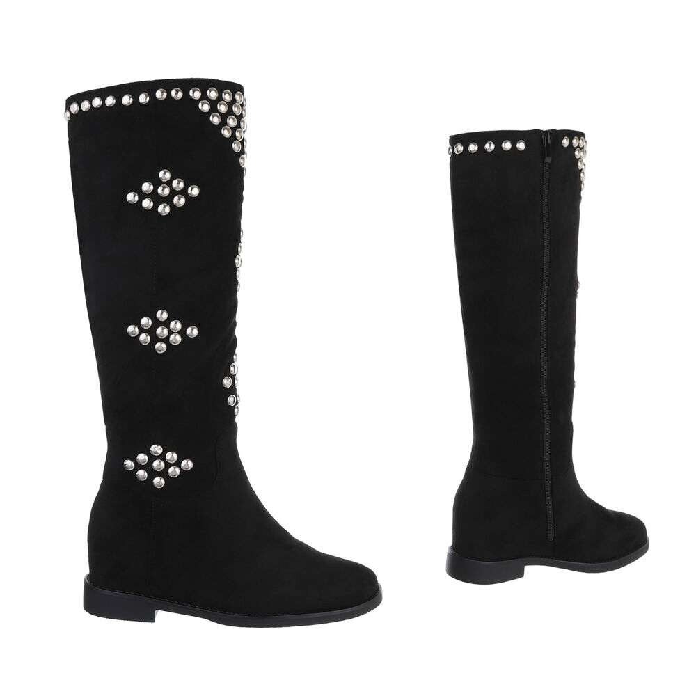 Suede laarzen zwart met zilveren bewerkingen bling bling, Een kort hakje 2cm aan de achterkant ,normale ronding aan de voorkant , en ritssluiting aan de binnenzijde van deze sjieke laars. maat 40 Givana totale hoogte 45cm bovenkant breedte eenzijdig gemeten 19cm