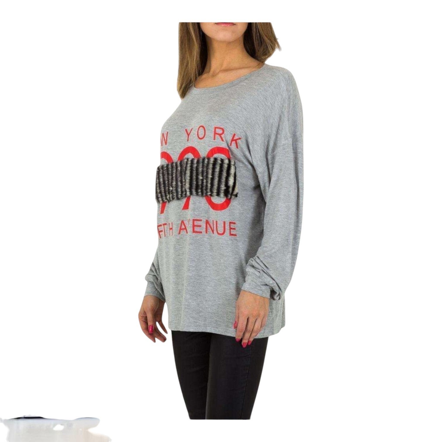 nieuw. Lange mouw oversized shirt ronde hals en speciale stof opdruk over het jaartal 1990. New York Fifth Avenue. kleuren grijs zwart wit rood. Materiaal: 95% Viskose, 5% Elasthan. maat S/36 afmetingen plat gemeten: schouder 60cm oksel 56cm lengte 66cm. merk: JCL.