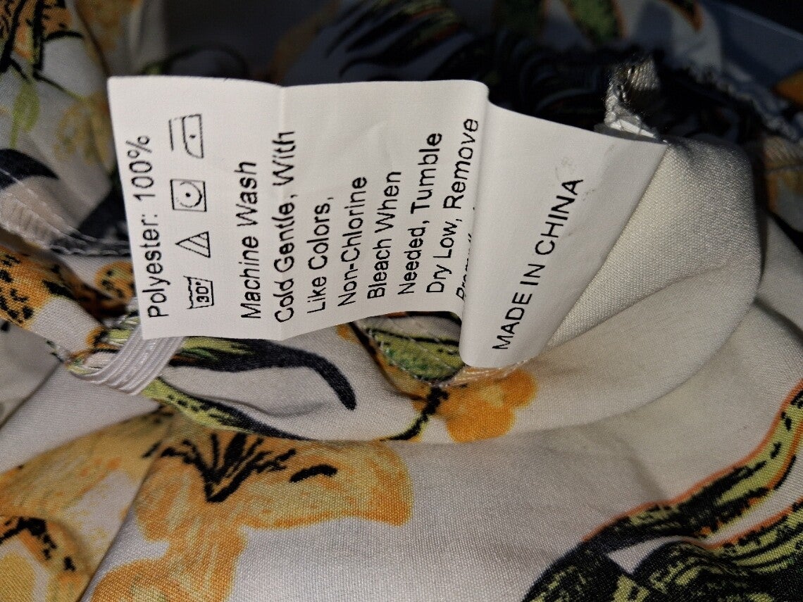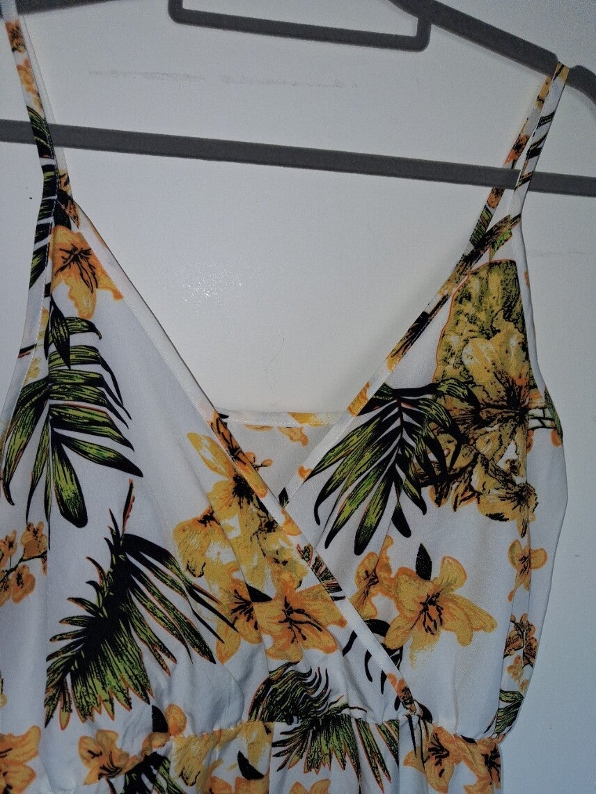 Zo goed als nieuw. Deze playsuit heeft een levendige print van gele bloemen en groene bladeren op een witte achtergrond. Het kledingstuk heeft spaghettibandjes en een overslagdetail aan de voorkant, wat zorgt voor een speelse en luchtige uitstraling. De taille is elastisch, wat bijdraagt aan het draagcomfort. De korte broekspijpen maken het een ideaal kledingstuk voor warm weer. maat XL. 100% polyester.