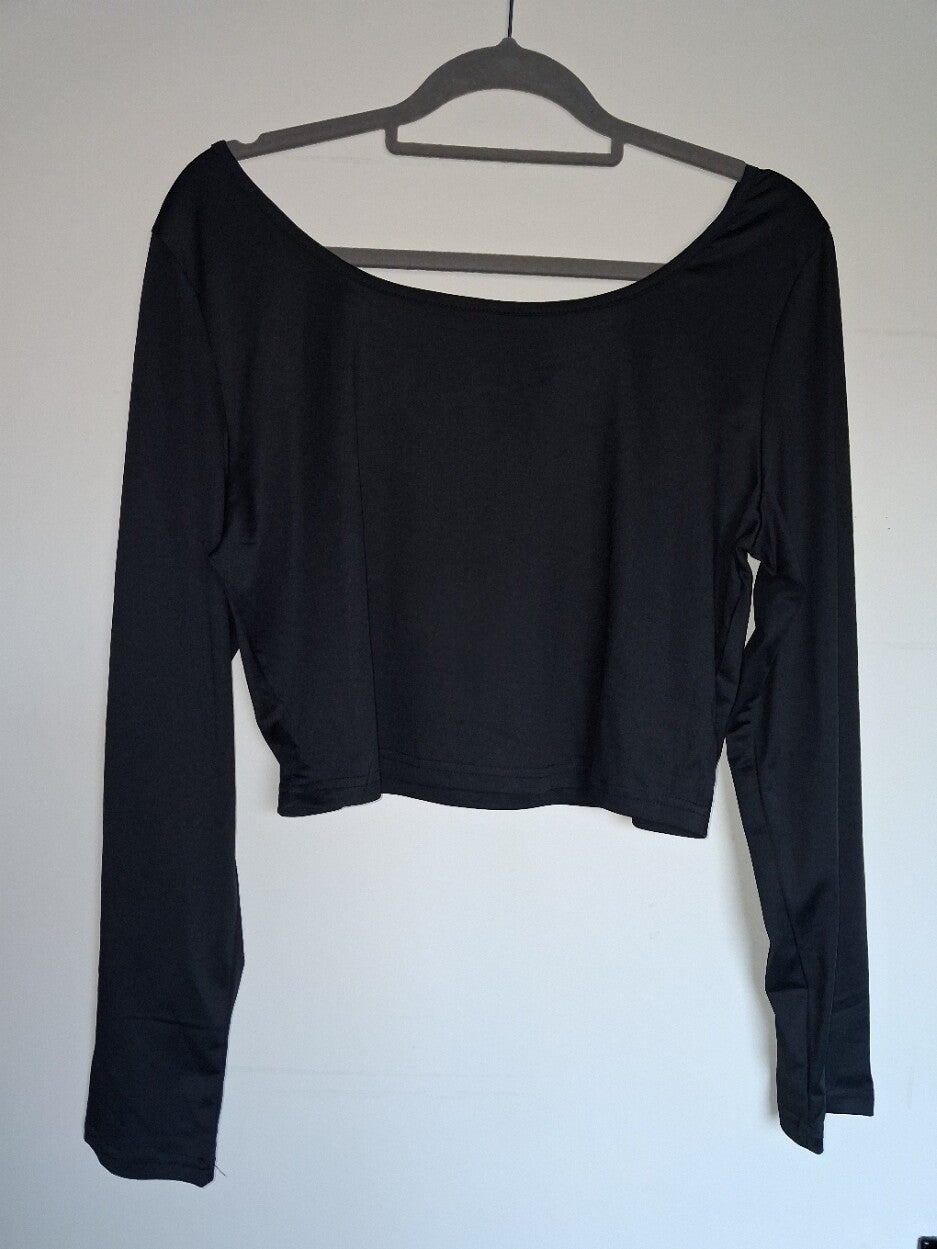 Weinig gedragen. Crop shirt te dragen voor over ander shirt of topje. Deze top heeft lange mouwen en ronde hals. Kleur zwart. maat XXL 100% polyester