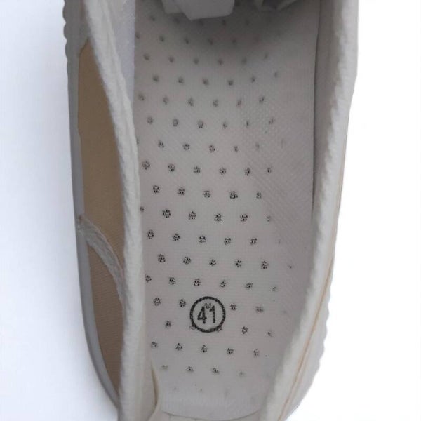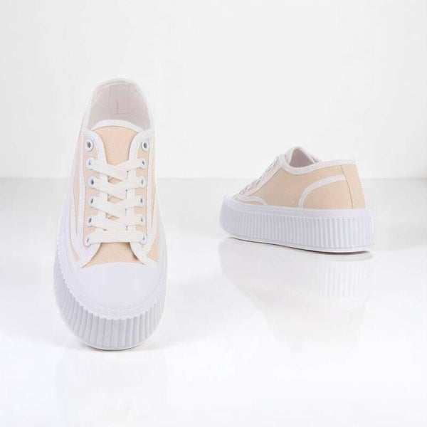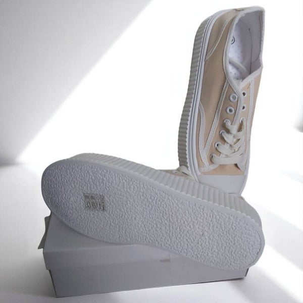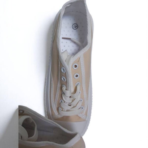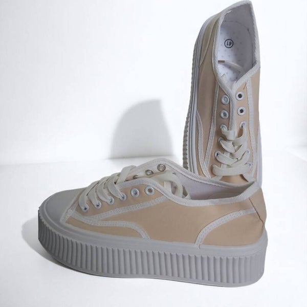 Gympen in zachte beige kleur met dikke witte profielzool en vetersluiting. Maat 41