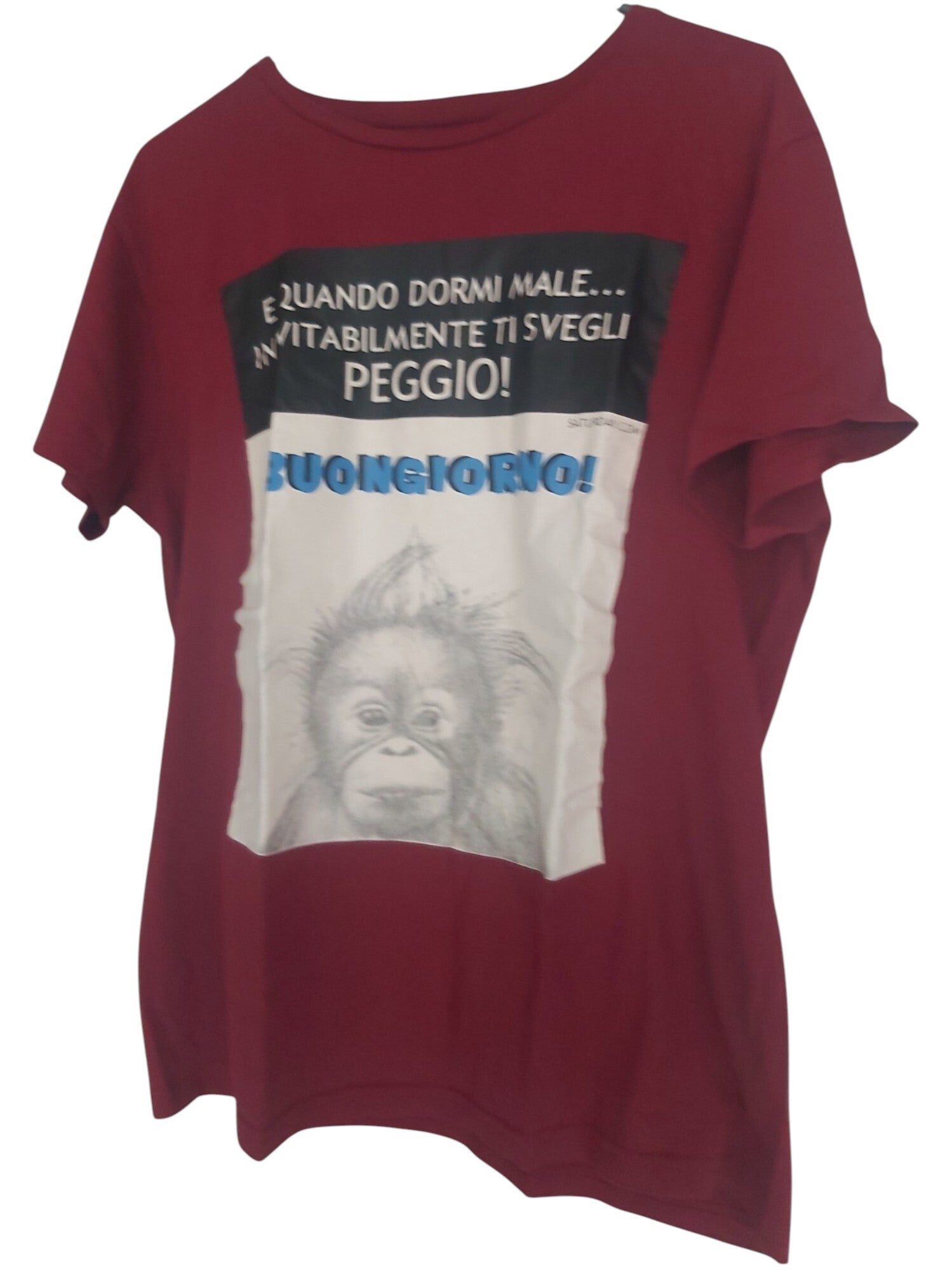 Heren t-shirt getailleerd met aap opdruk wijnrood maat L oksel 53cm schouder 45cm lengte 66cm 100% katoen