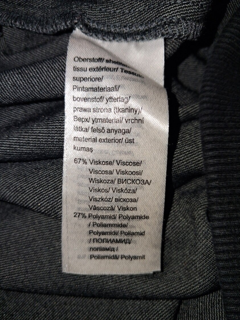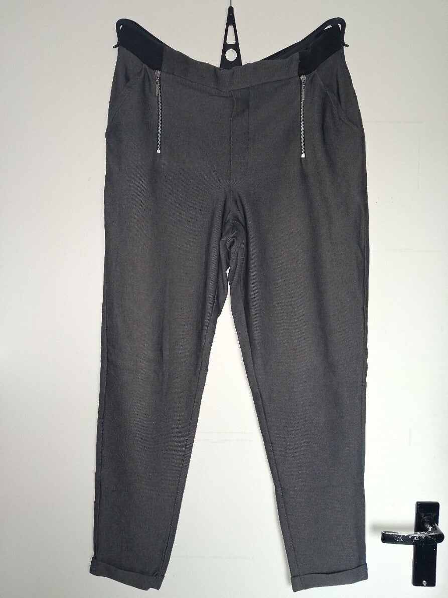 Donkergrijze broek met een comfortabele pasvorm. De broek heeft een elastische tailleband en decoratieve ritsen aan de voorkant. insteekzakken aan de voorkant. De pijpen zijn omgeslagen voor een casual look. merk bodyflirt maat 40/42 taille rekbaar 44-56cm lengte 92cm.