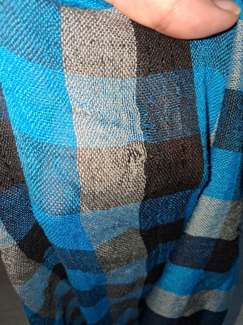 Veel gedragen, heeft wel beetje gebruikers haaltjes, Maar alleen zichtbaar, van heel dichtbij. (zie foto)Fashion sjaal / omslagdoek met blok patroon en sliertjes in de kleuren blauw grijs 90x90cm