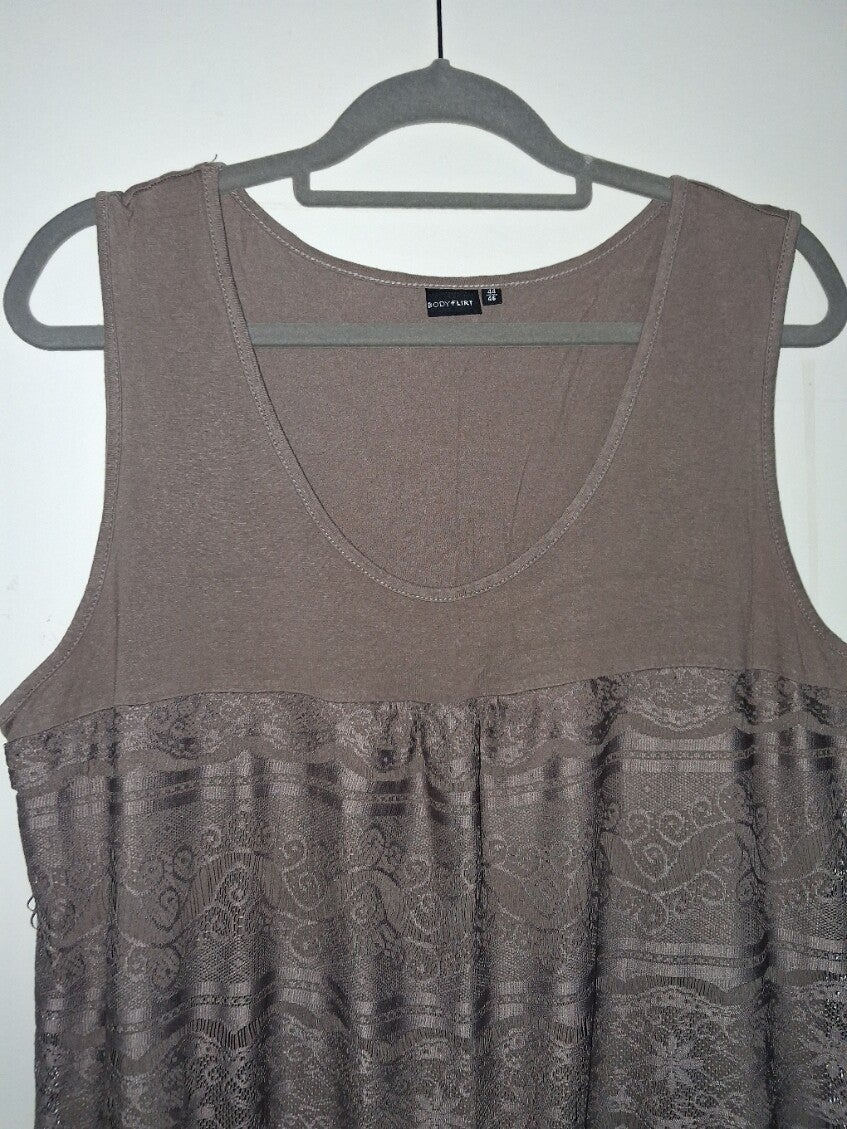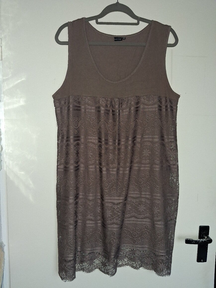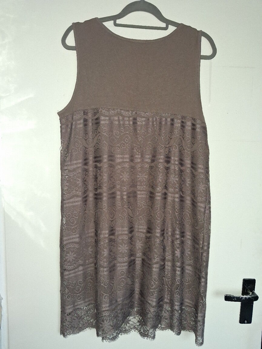Nette, bruine jurk van het merk Bodyflirt. De jurk heeft een kanten toplaag en een onderrok. Mouwloos model. Maat 44/46. Let op: zonder ketting.Deze jurk komt tot kniehoogte. Materiaal label ontbreekt. maat 44/46 XXL/XXXL afmetingen plat gemeten oksel rekbaar 53-67cm lengte 88cm.