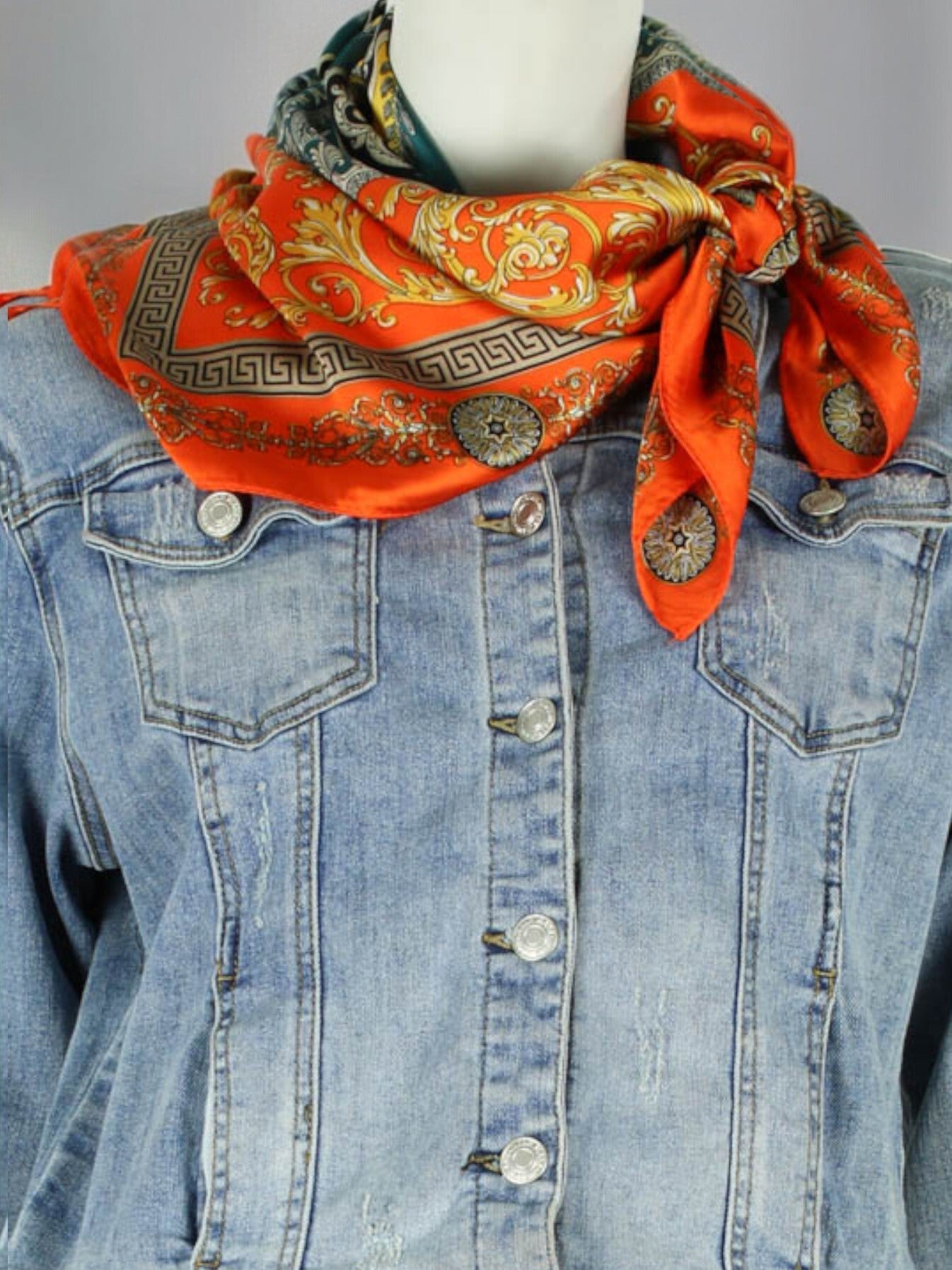 Soepele sjaal in het vierkant met zijde feeling. Materiaal: 100% polyester. De afmeting van de sjaal is: 70 cm breed 70 cm lang. kleuren oranje geel goud.