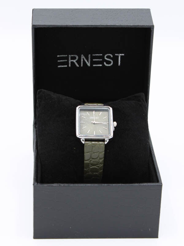 Op zoek naar een mooi cadeau voor je vrouw, vriendin, dochter? Met dit horloge hoef jij niet verder te zoeken. Vierkant army groen / zilverkleurig horloge van Ernest met crocoprint PU bandje. De diameter is 3,8 cm. Totale lengte 23cm. Let op de doos op de foto word niet meegeleverd.