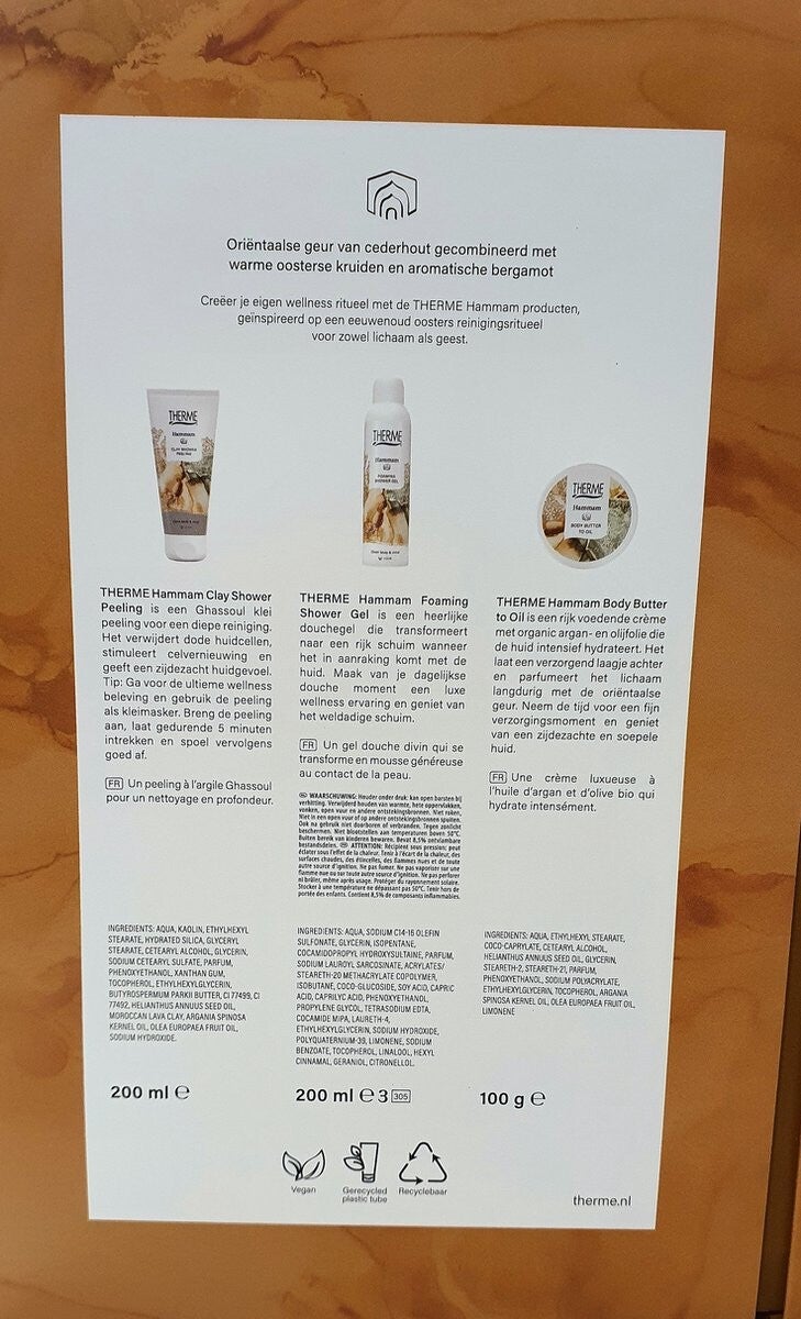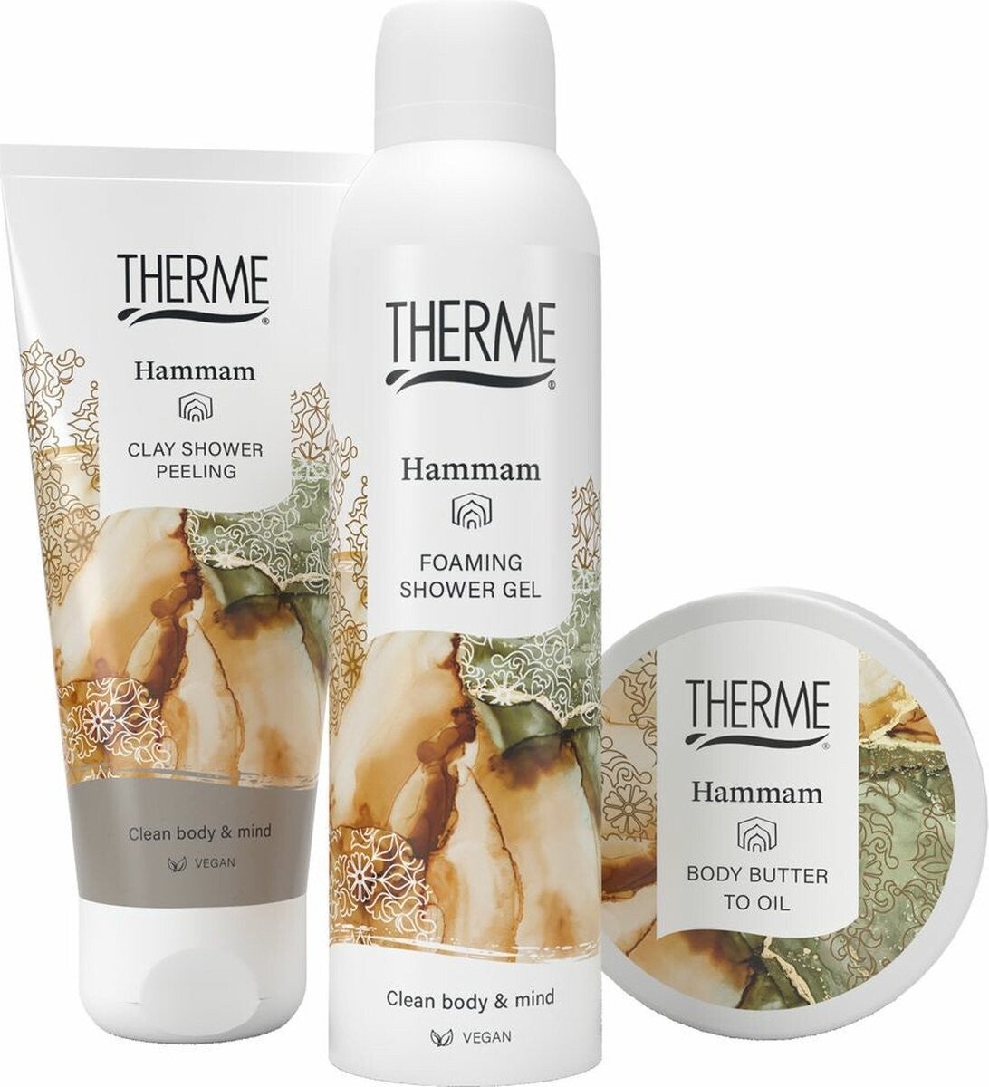- Inhoud: Therme Hammam Clay Shower Peeling 200ml, Therme Hammam Body Butter to Oil 100g, Therme Hammam Foaming Shower Gel 200ml