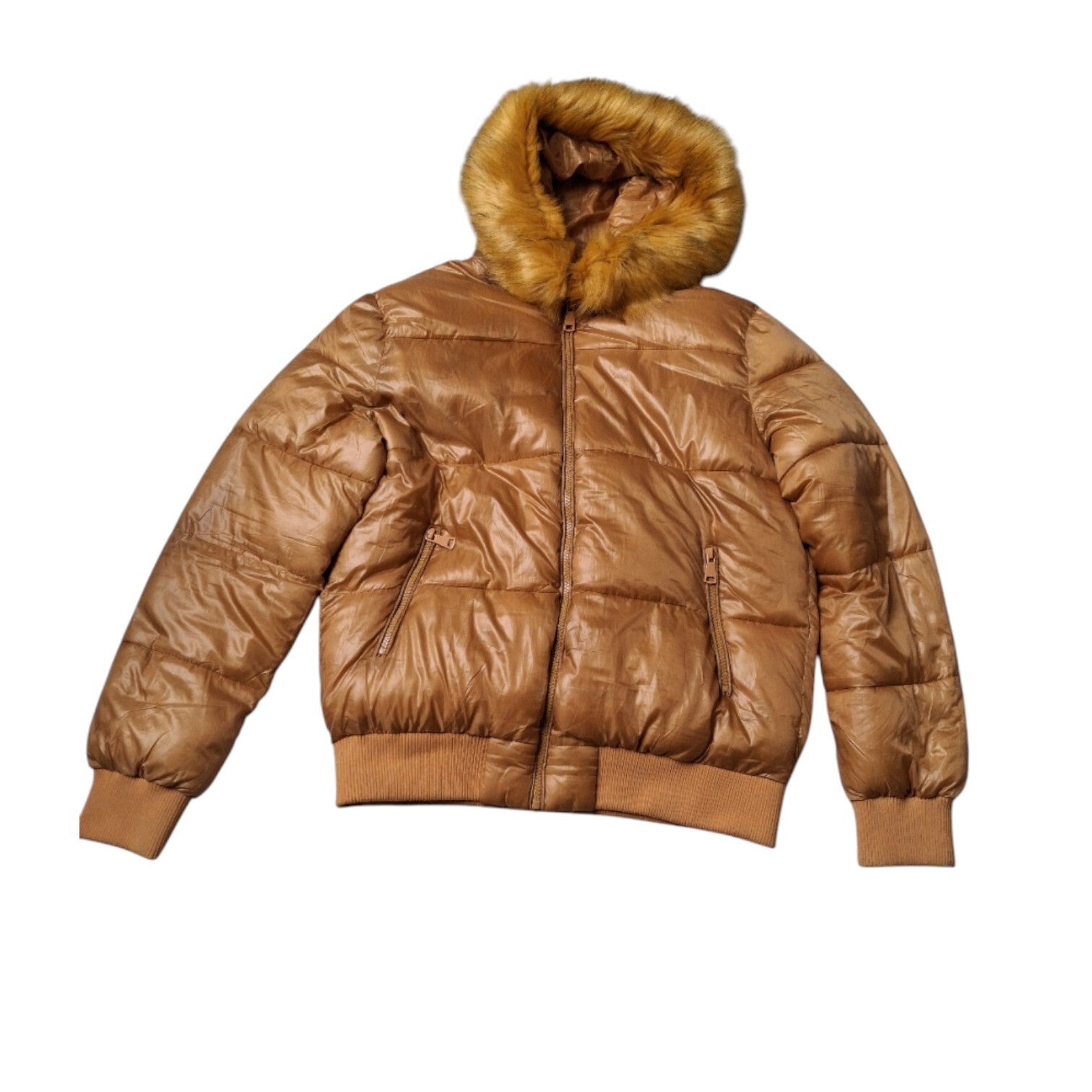 Winterjas warm met vaste cappuccino, bontje kan er wel vanaf maat XL afmetingen plat gemeten schouder 46cm. oksel 60cm. lengte 64cm. binnenarmlengte 51cm. buitenarmlengte vanaf schouder 65cm. Merk noemi kent.