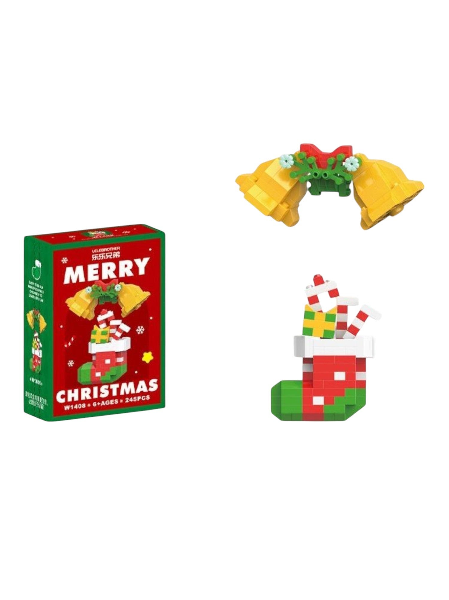 Merry christmas klein formaat Lego kerst blokken set. Bestaande uit kerstsok en kerstbellen. Maak de kerst extra leuk voor je kind. Leuk speelgoed voor uren speelplezier. Afbreken en opbouwen maar weer. Door het kleine formaat ook leuk om mee te nemen, naar opa en oma, ooms en tantes, of naar vrienden.