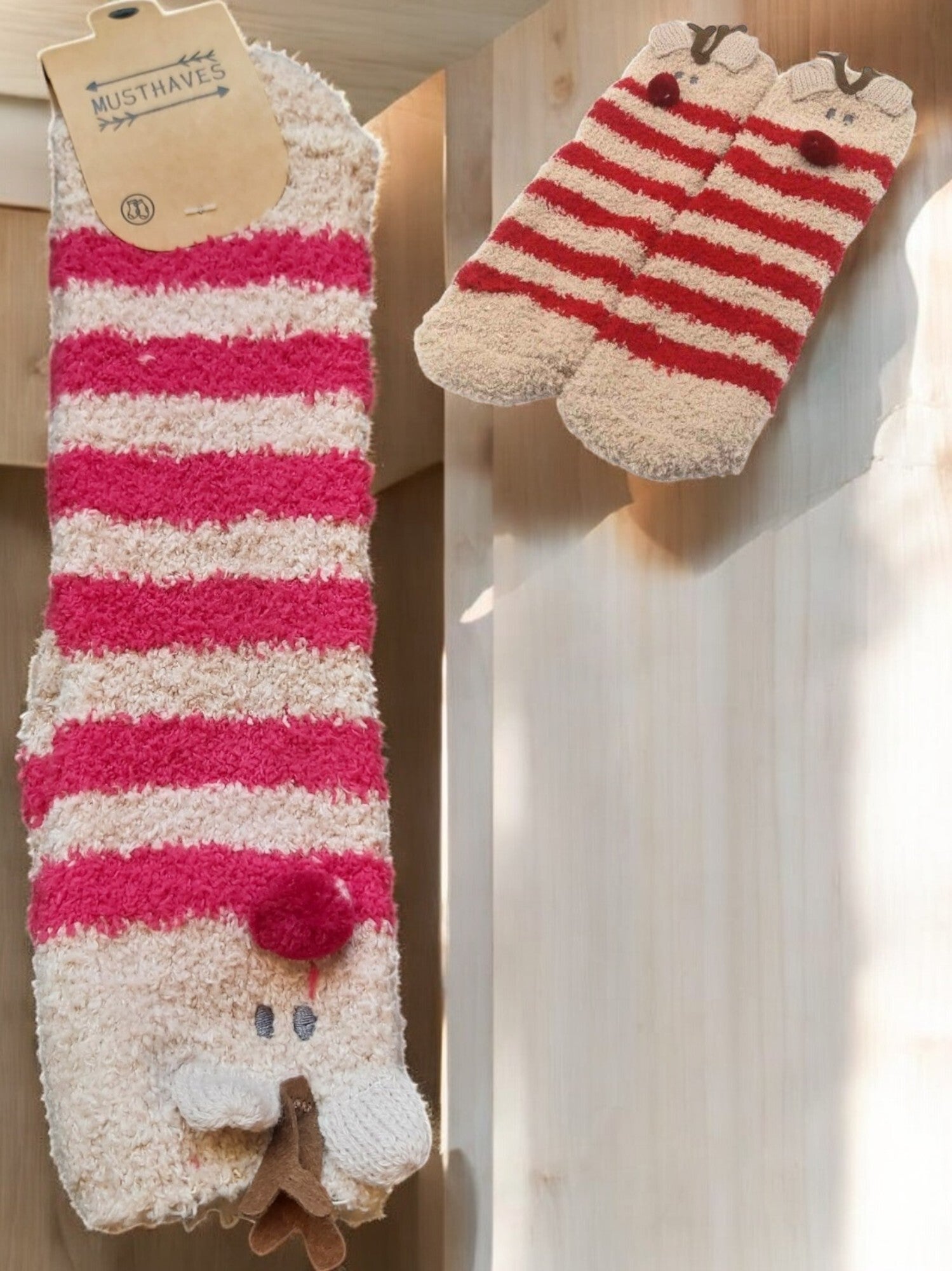 Leuke, vrolijke gestreepte fluffy zachte sokken met daarop een grappige rendier print. De sokken zijn gemaakt van een zachte en soepele katoenmix en zijn geschikt voor verschillende schoenmaten, vanaf schoenmaat 35 tot en met 40.