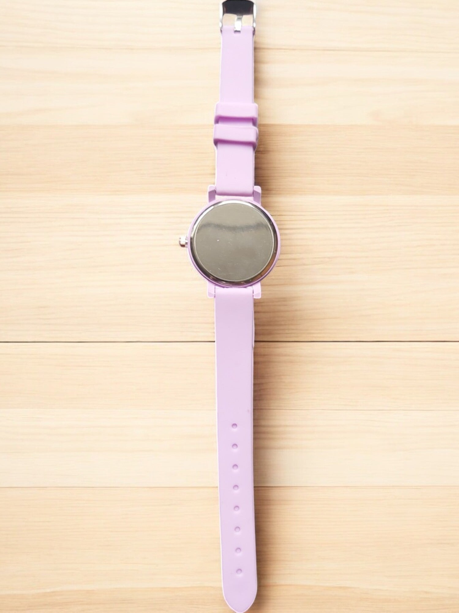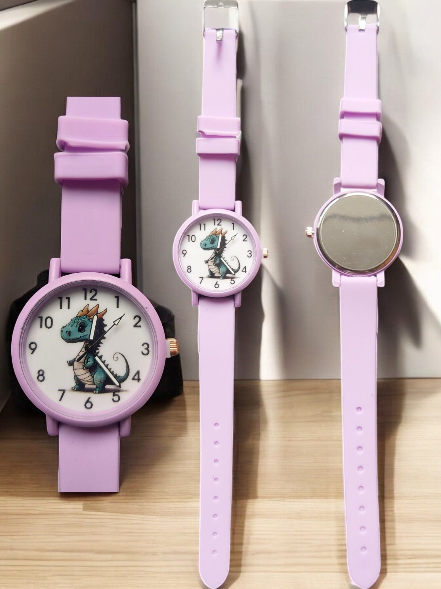 Een mooi kinderhorloge met op de wijzerplaat een afbeelding van een draakje. Kleur paars. In dit bandje zitten acht gaatjes, waarop je de gesp stevig kan vastzetten. De kast heeft een diameter van 34 millimeter en dankzij het kwartskristal - internationaal bekend als quartz - heeft dit klokje een zeer precieze tijdsaanduiding.