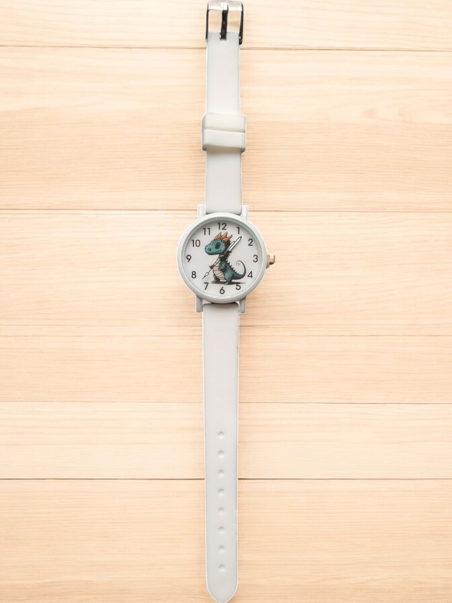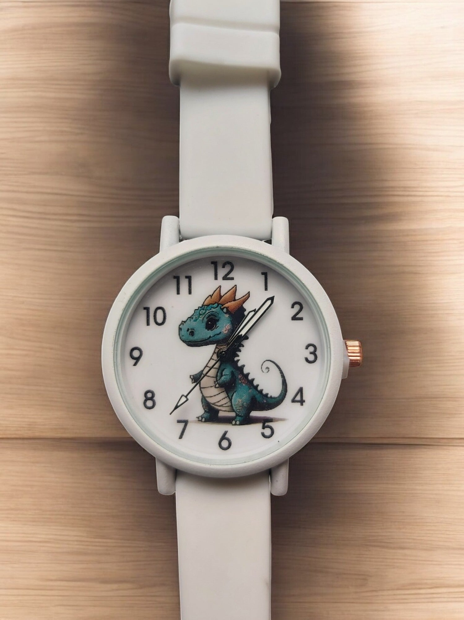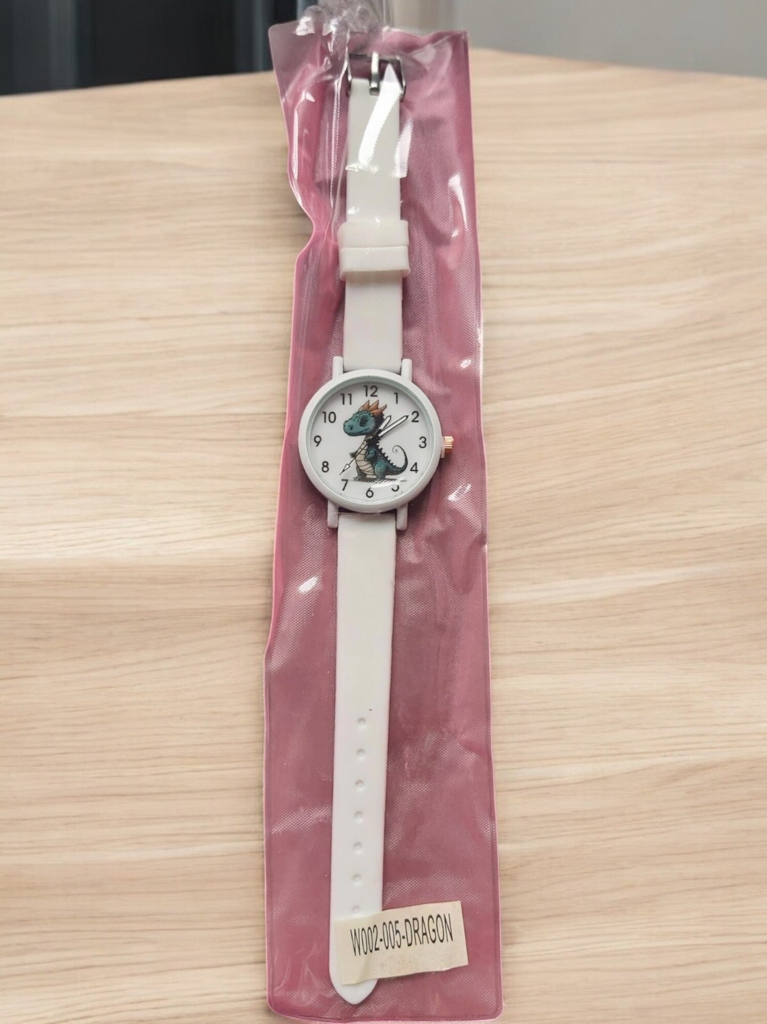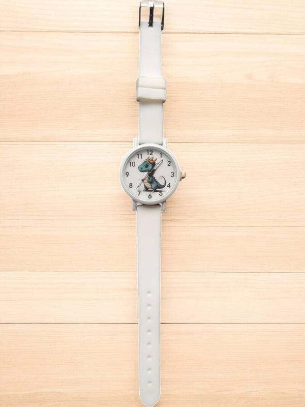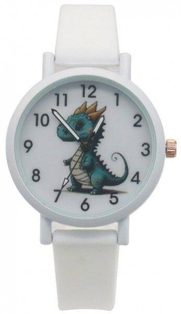 Een mooi kinderhorloge met op de wijzerplaat een afbeelding van een draakje. kleur wit. In dit bandje zitten acht gaatjes, waarop je de gesp stevig kan vastzetten. De kast heeft een diameter van 34 millimeter en dankzij het kwartskristal - internationaal bekend als quartz - heeft dit klokje een zeer precieze tijdsaanduiding.