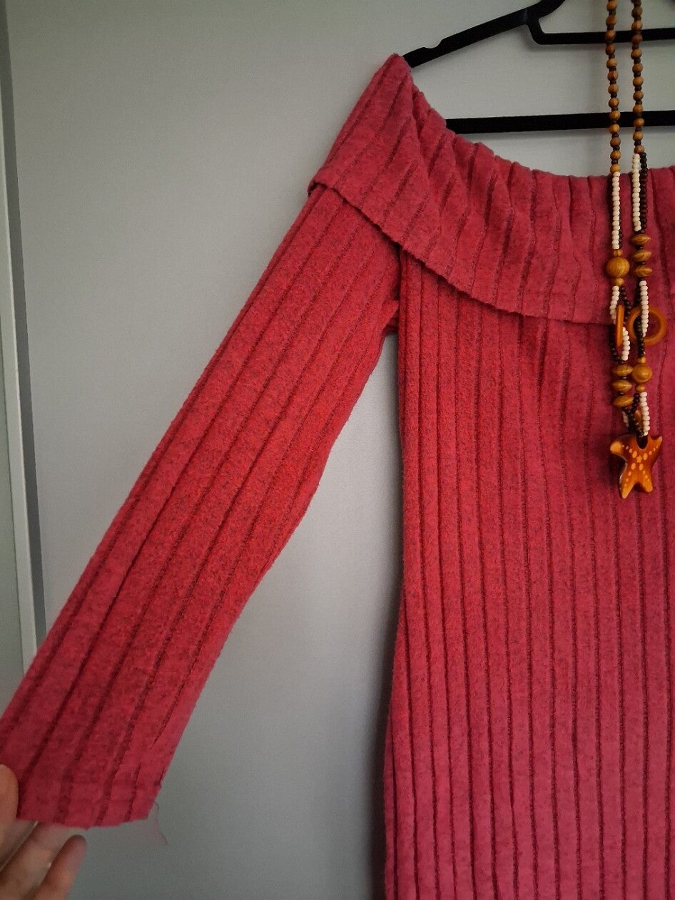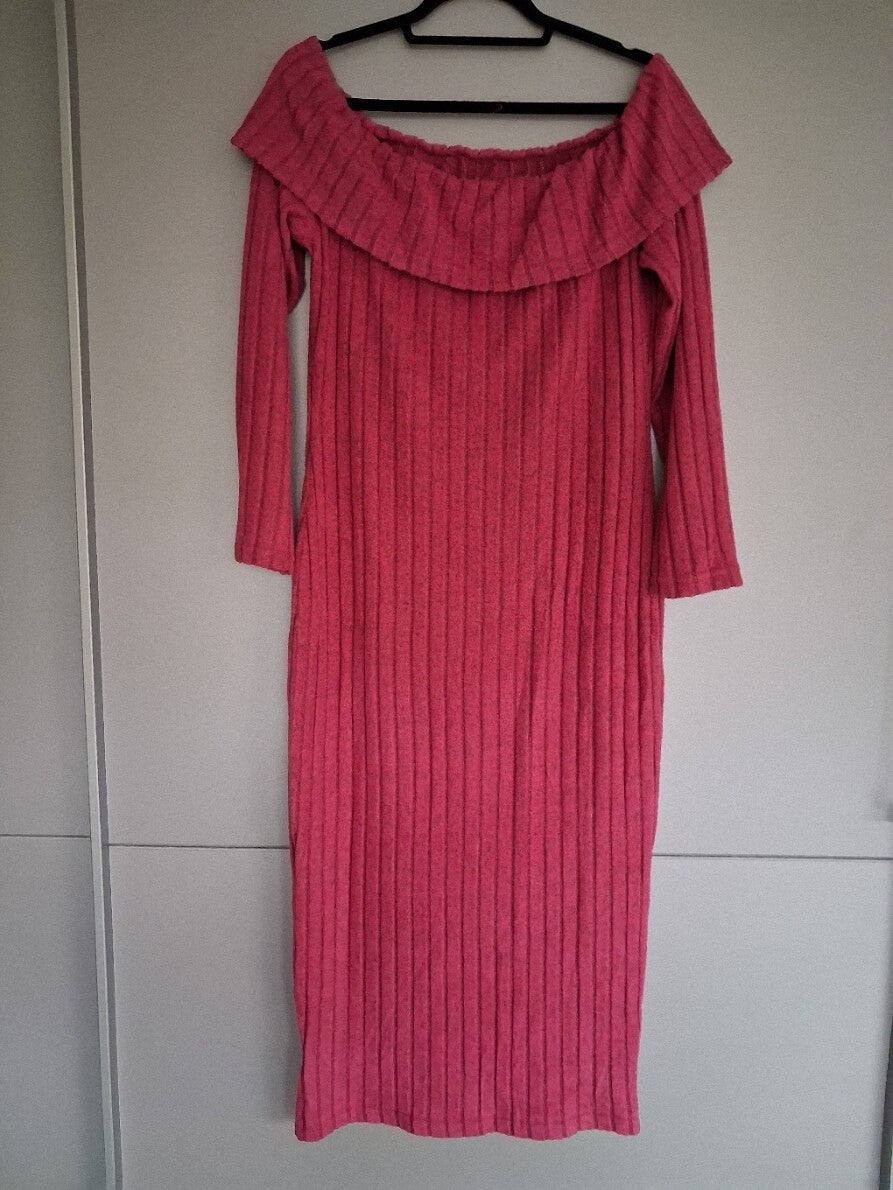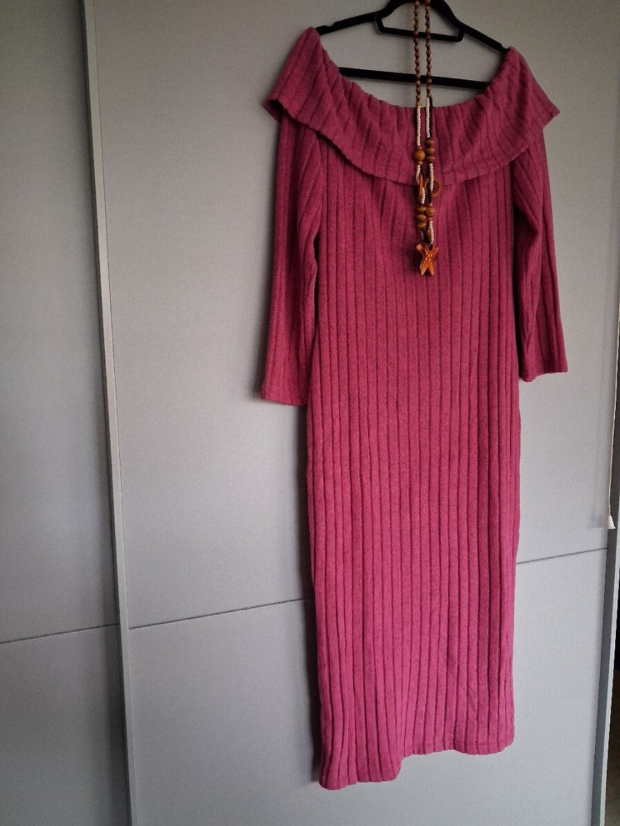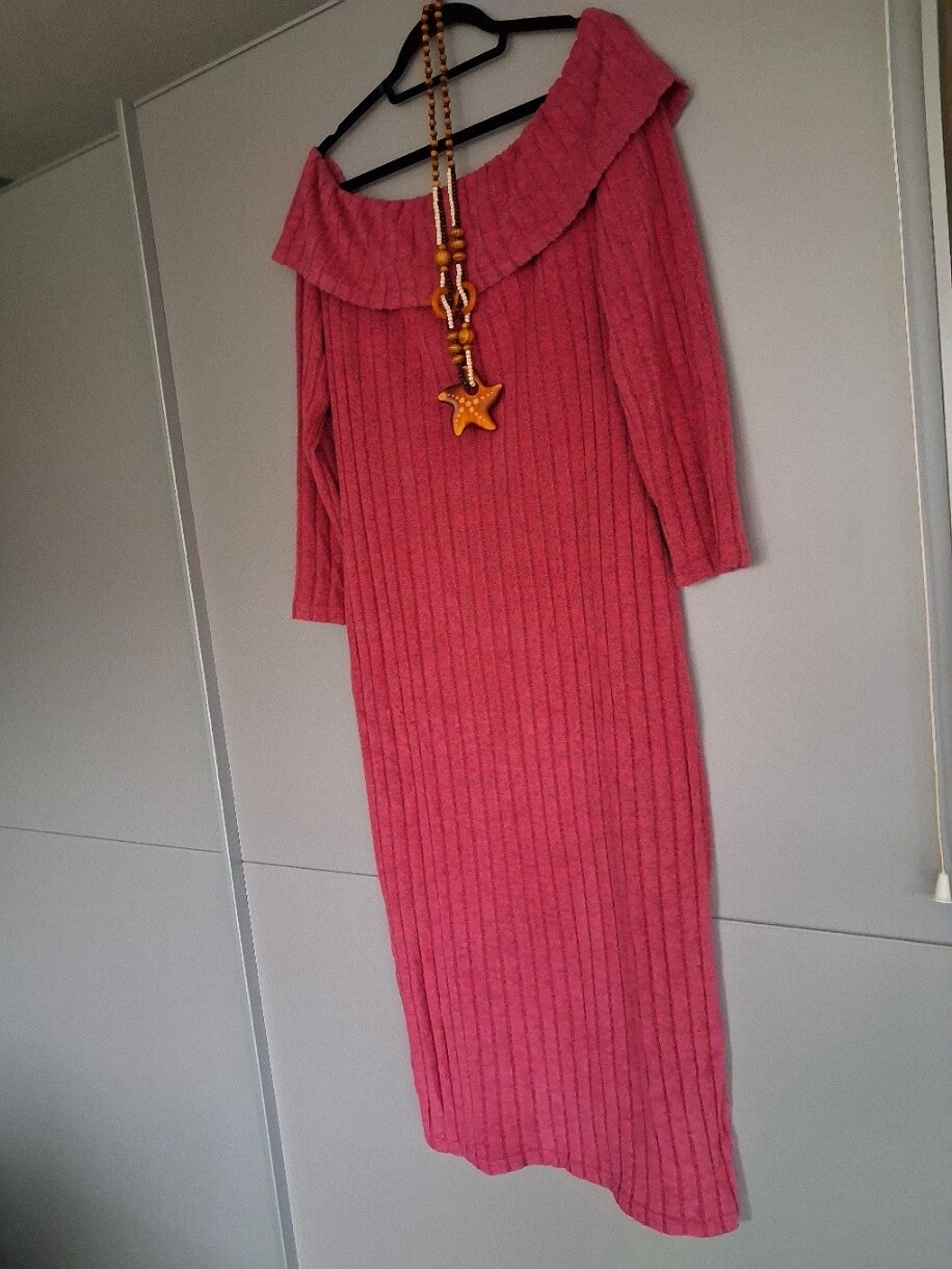 Zo goed als nieuwe, aangenaam zachte roze winterjurk in maat XXL. De jurk heeft een off shoulder model (blote schouders). Let op: wordt zonder ketting verkocht. Bij bestelling op werkdagen voor 15:00, wordt de jurk dezelfde dag verzonden. 95%polyester 5%elasthane.