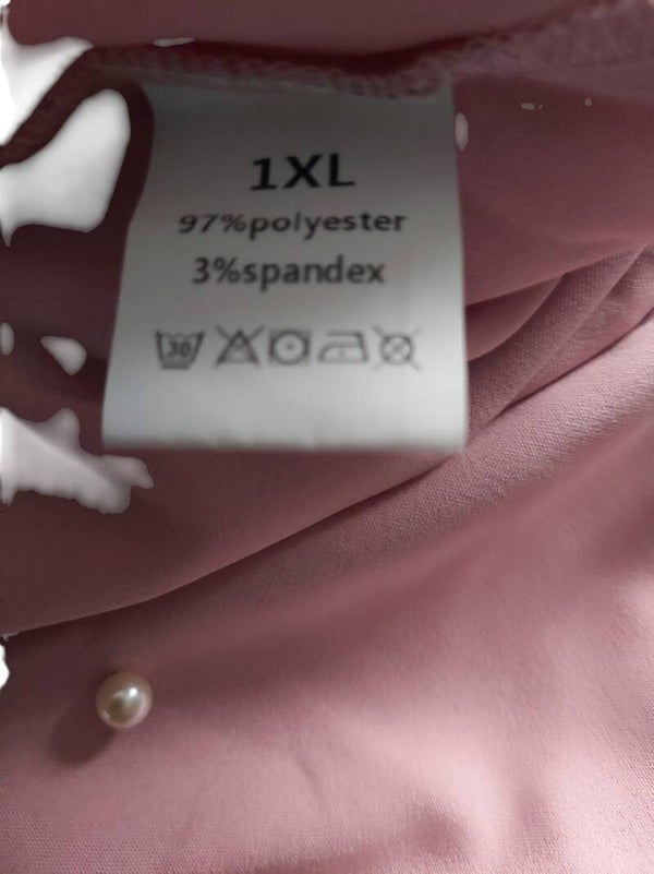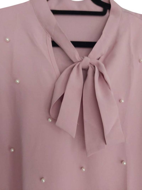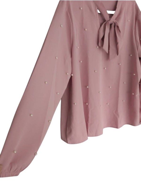 Weinig gedragen. Chic tuniek / shirt in lichtroze kleur met parels en strik koord. De mouwen van dit tuniek hebben elastische bandjes. Dit tuniek is gemaakt van 97% polyester 3% spandex. Maat XL. afmetingen plat gemeten. Schouder 47cm. Oksel 60cm. Buitenkant armlengte 60cm. Binnenkant armlengte 49cm. Totale lengte 71cm.