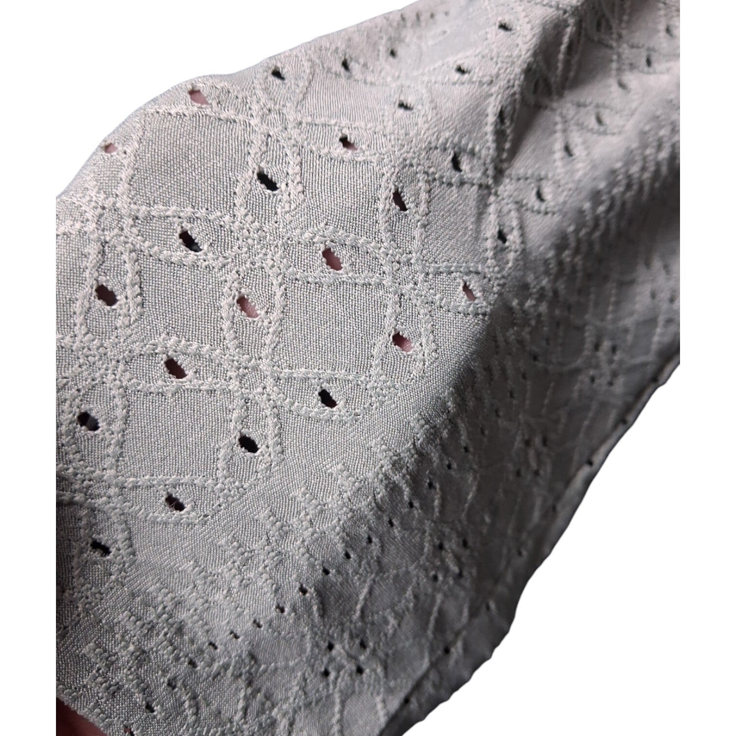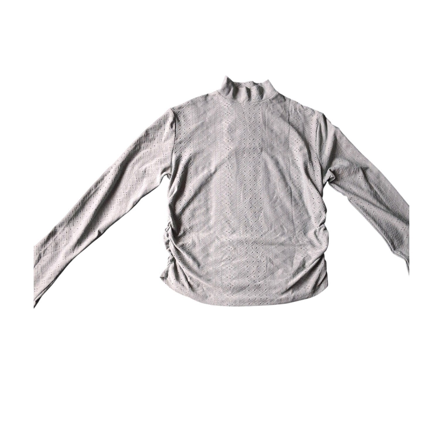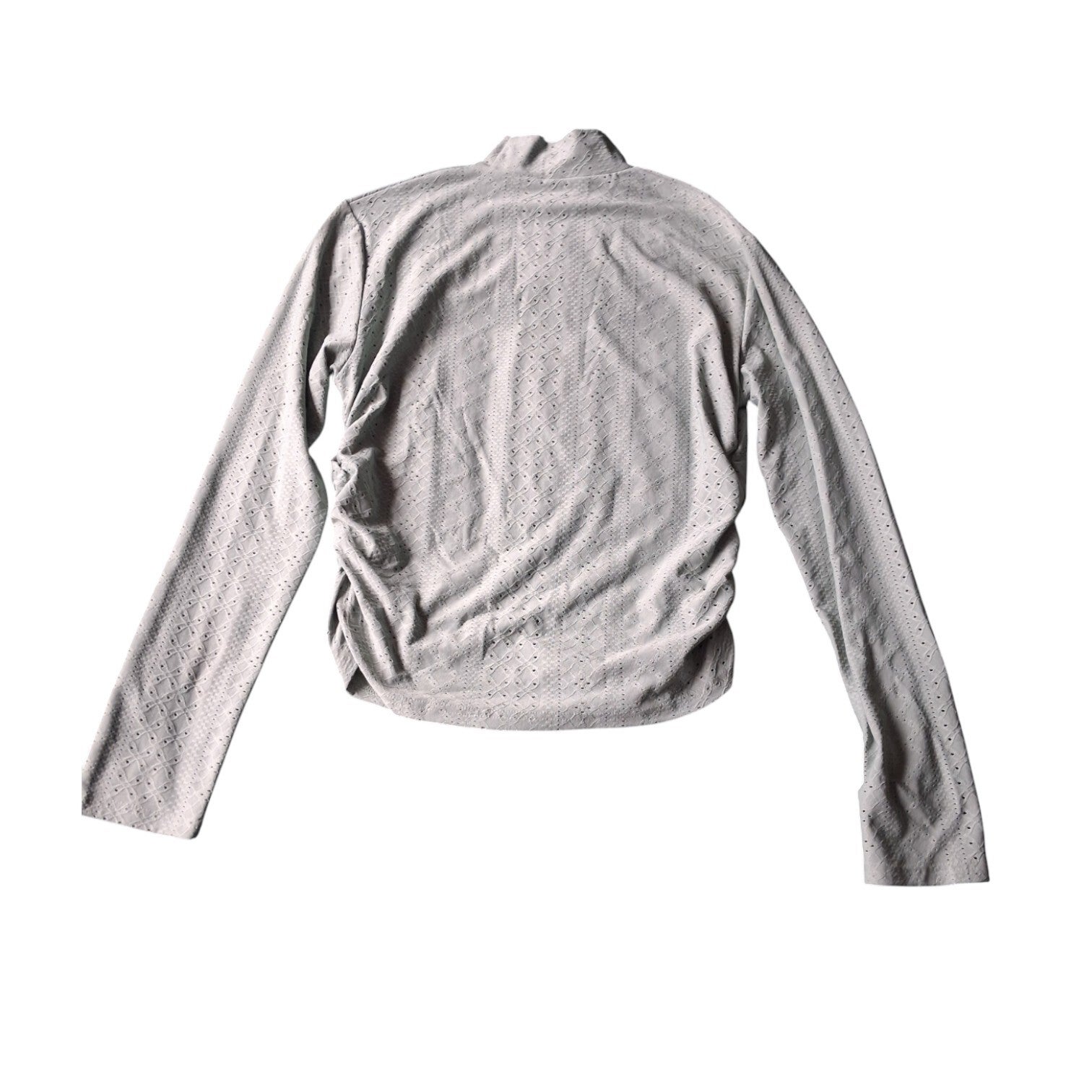 Weinig gedragen. Aansluitend shirt in pastelkleur mintgroen met leuk gaatjes patroon. Dit shirt heeft een korte col en lange mouwen en is lekker rekbaar. En is gemaakt van 95% polyester en 5% spandex. (op de foto lijkt deze grijs van kleur, in werkelijkheid is deze mintgroen). maat 2XL/44