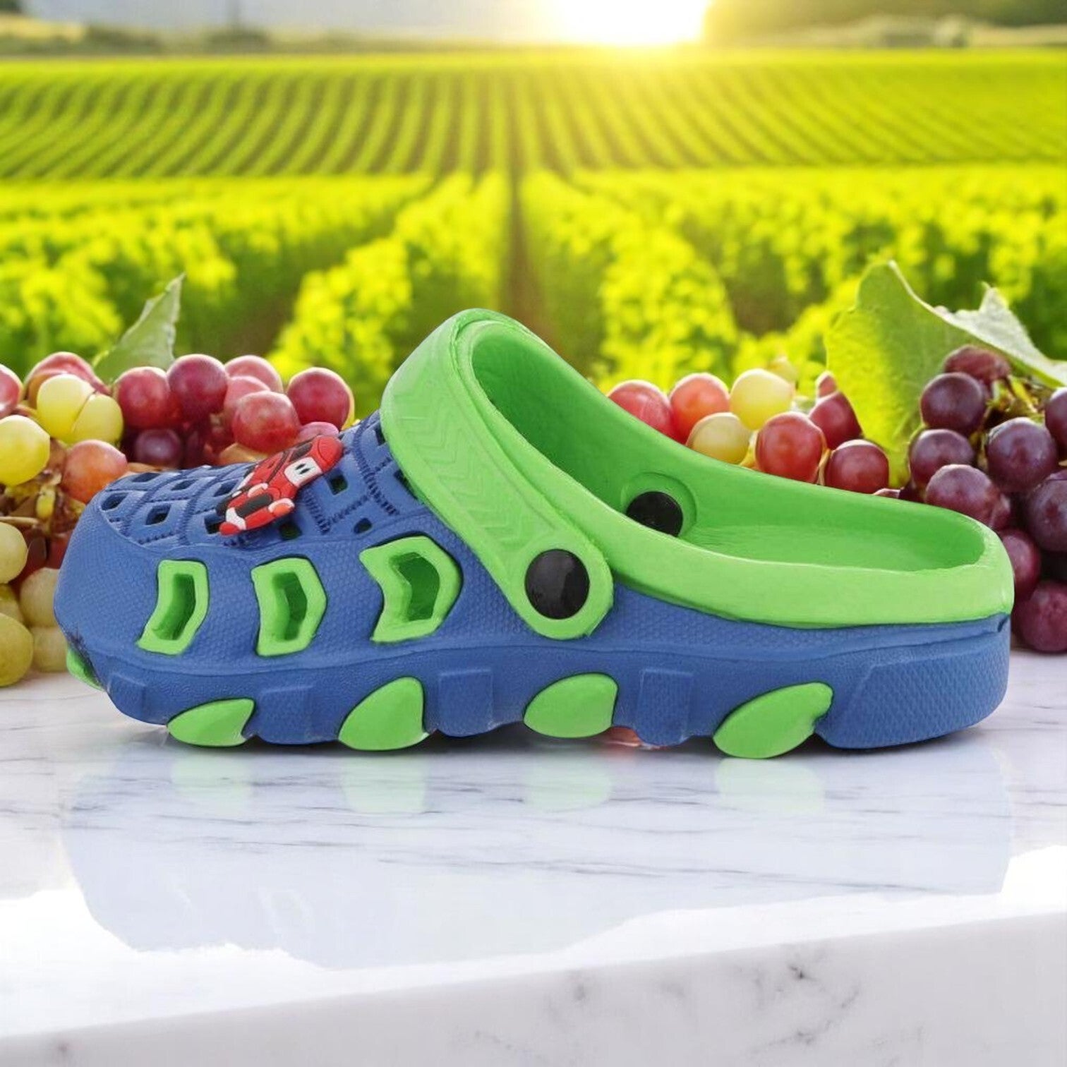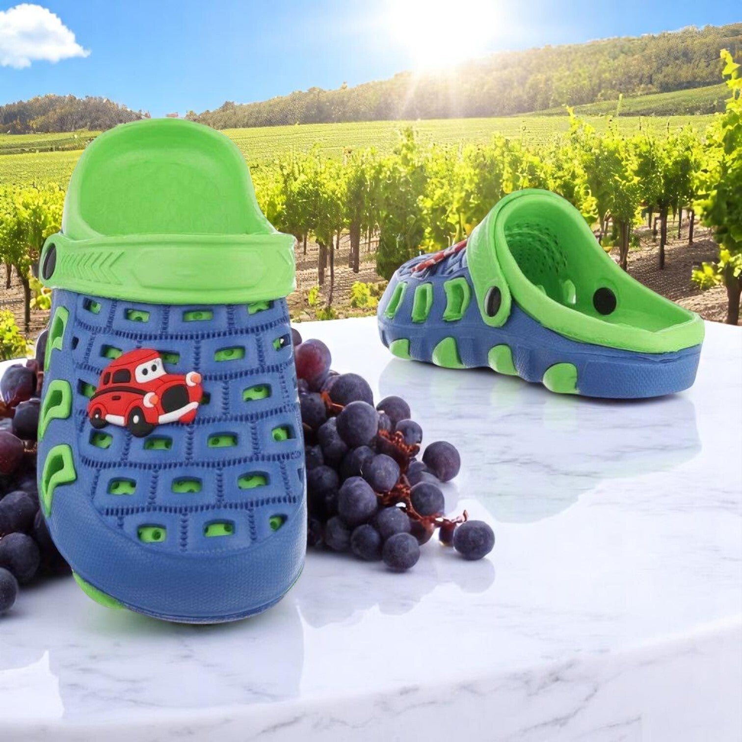 Verwen je kleintje met deze sippers schoenen. Met cars auto afbeelding opdruk. Kinderen lopen er graag op, en zo handig voor naar het strand , zwembad , camping. Kleuren blauw groen. Kleur cars auto rood wit zwart. materiaal rubber. maat 22