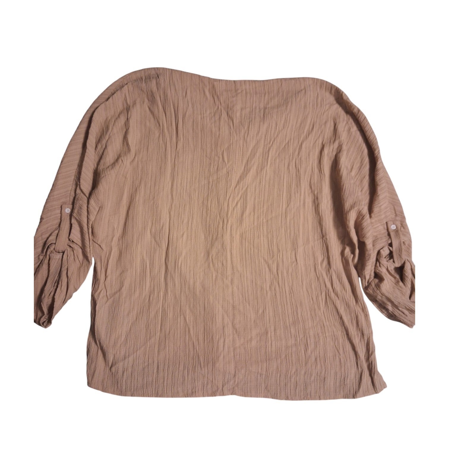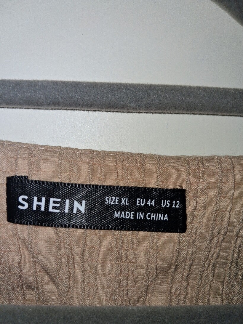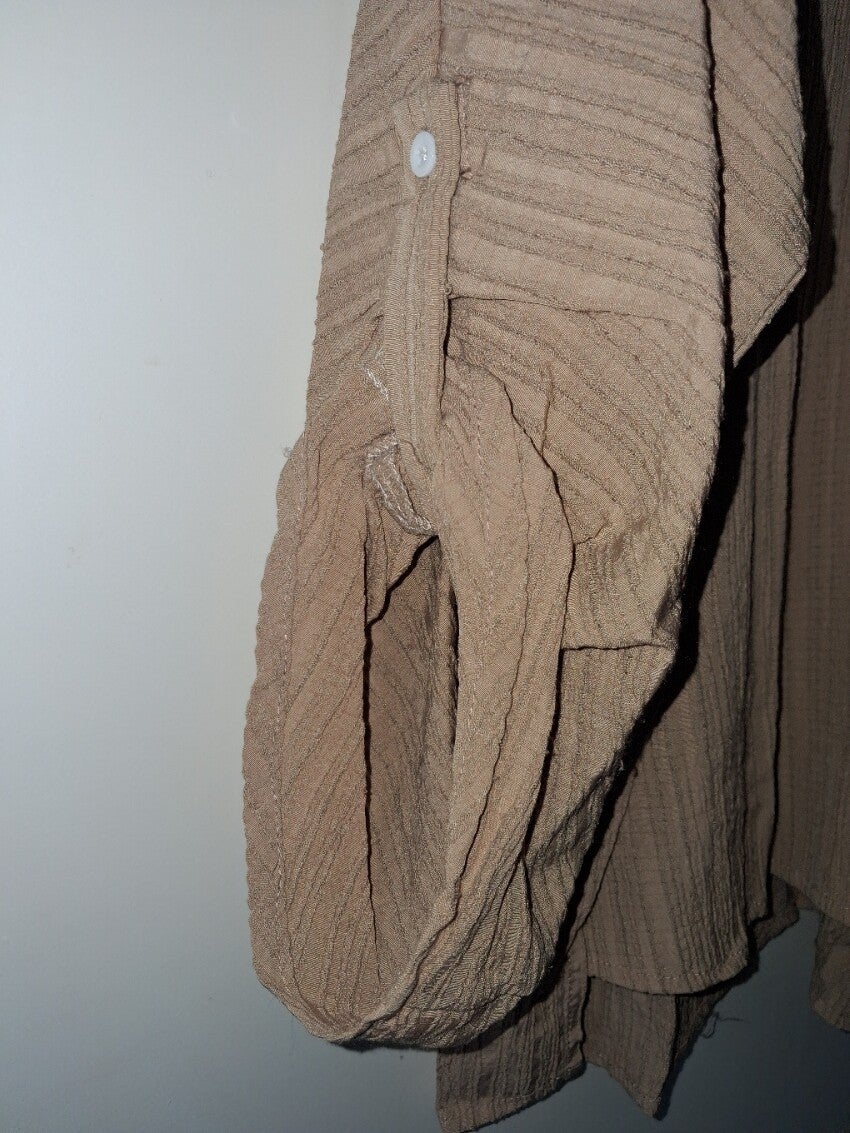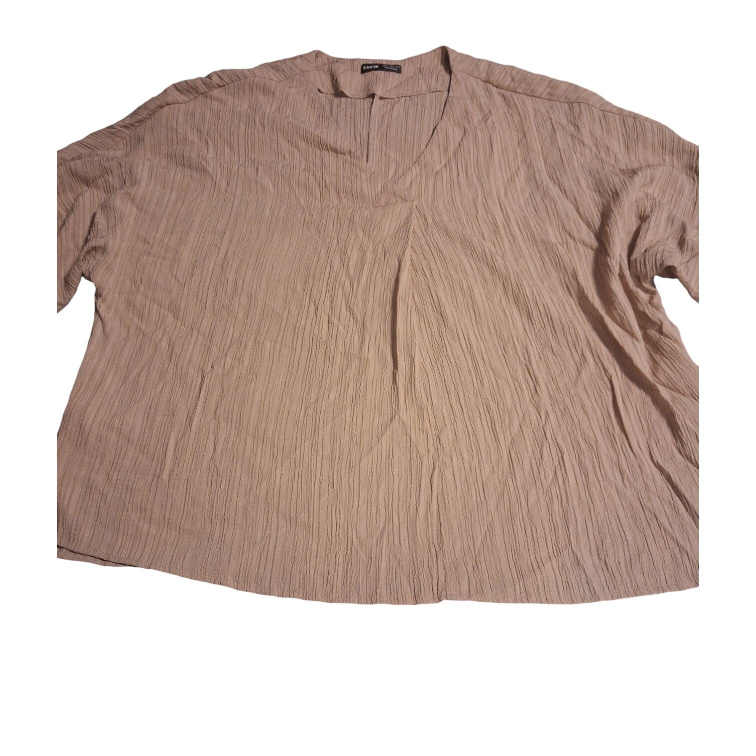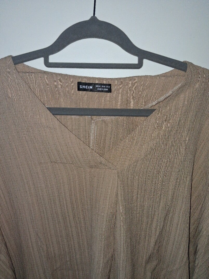 Weinig gedragen. Leuk wijd tuniek van geribde stof, de mouwen kunnen door de knoopjes hoger omgeslagen gedragen worden. Dit tuniek heeft driekwart mouwen en een v hals. Gemaakt van 66% polyester 31% viscose 3% elasthane. Maat XL afmetingen plat gemeten: oksel 70cm. lengte 72cm. Merk Shein.
