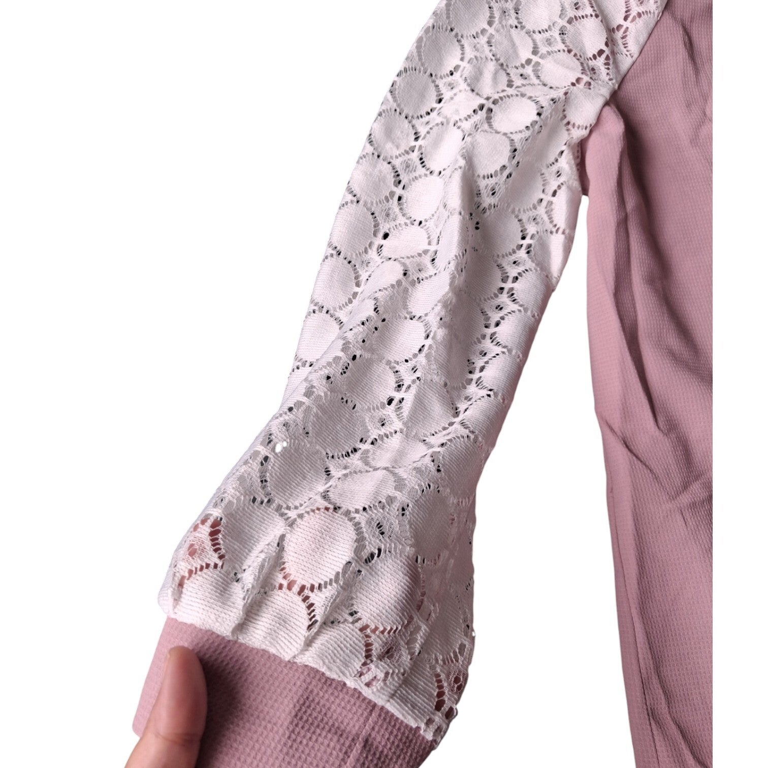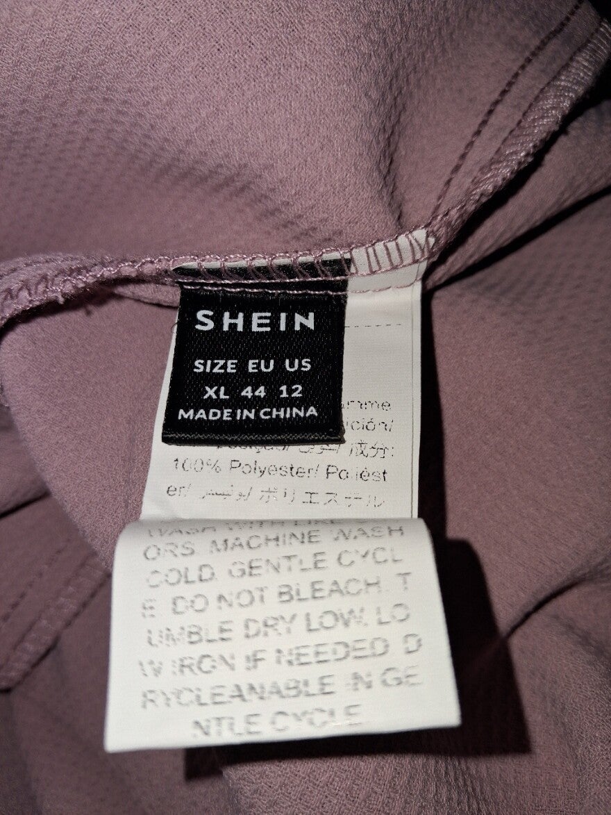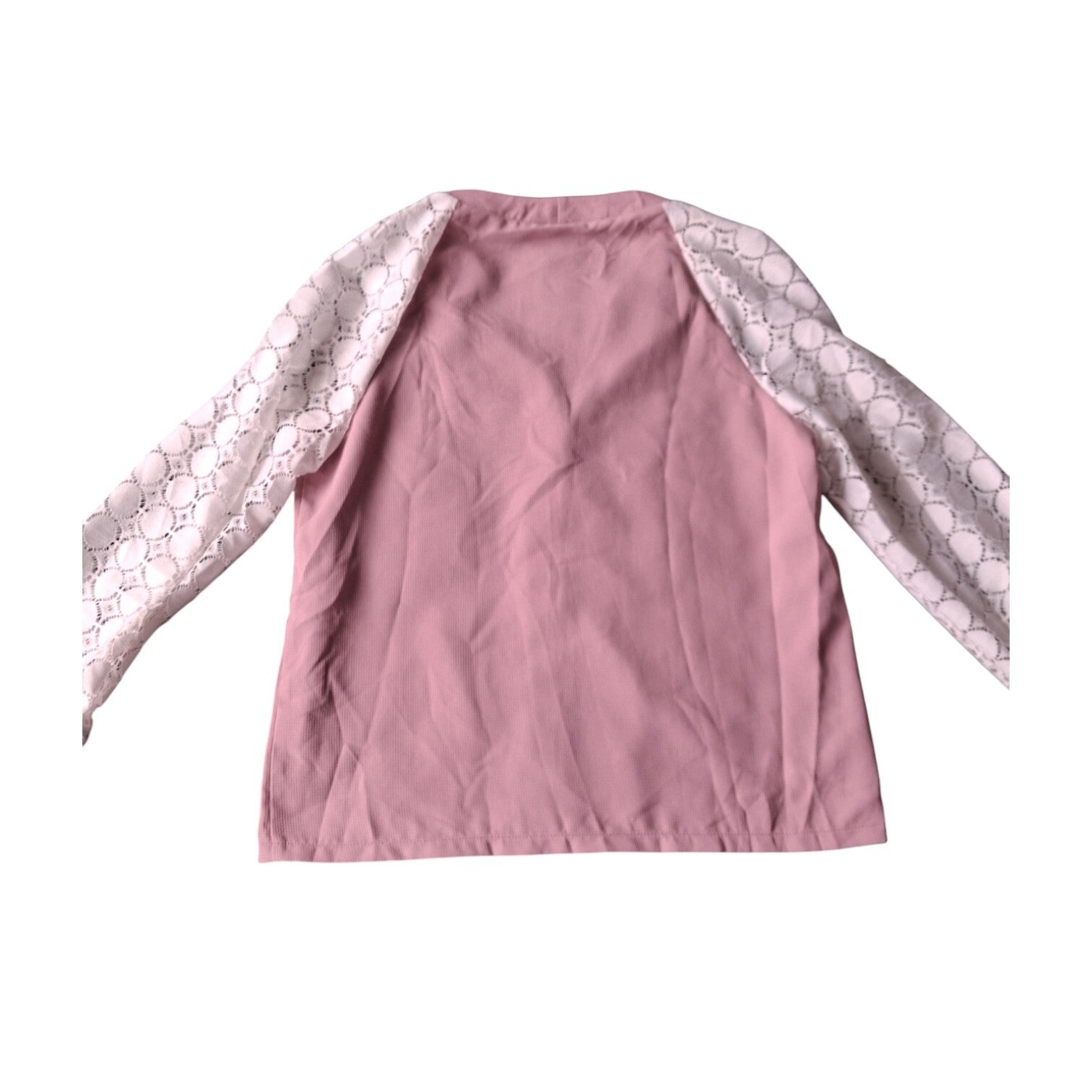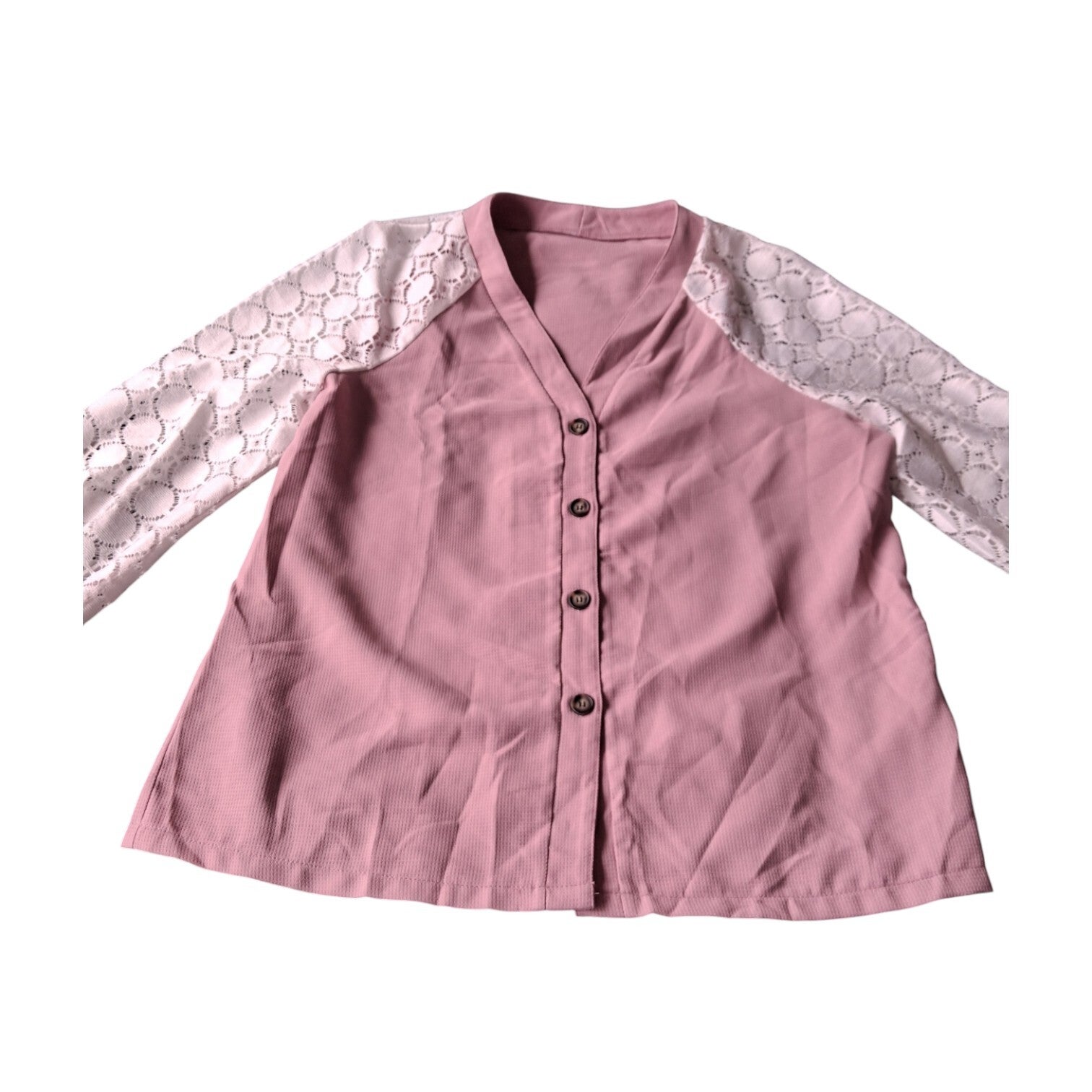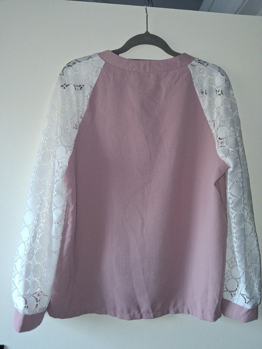 Weinig gedragen. Mooi shirt lichtroze met witte kanten mouwen, Dit shirt heeft knopen aan de voorzijde, een v hals en lange mouwem. Maat XL afmetingen plat gemeten oksel 55.5cm. lengte 69cm. armlengte 70cm. binnenkant armlengte 45cm. Dit shirt is gemaakt van 100% polyester. Merk Shein.