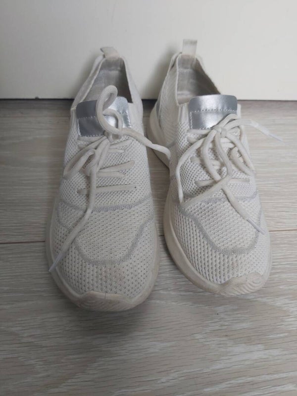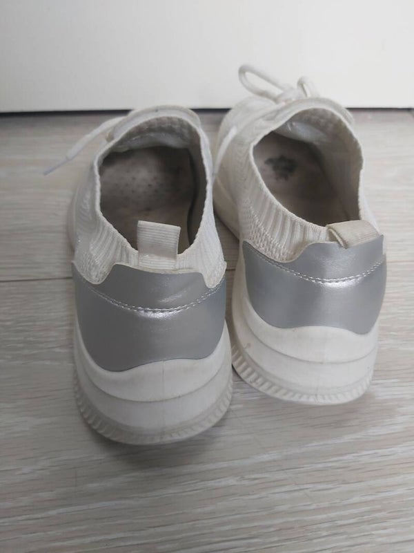 Witte sneakers met zilverkleurige glitters. Sluiten goed aan bij de hiel door de elastische band, Deze sneakers hebben een uitneembare zool, zodat u deze zelf kunt vervangen. Deze sneaker schoenen zijn bestendig voor in de wasmachine, met evt een kussensloop erom heen , en het zooltje eruit halen. Maat 40