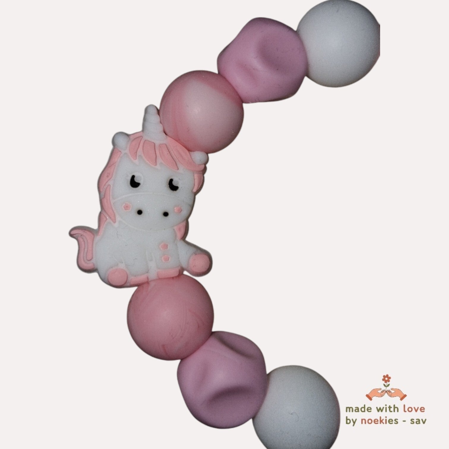 Handgemaakt. Thema Unicorn. Speenkoord met unicorn in de kleuren roze wit. Met deze speenkoord, raakt je kleintje zijn of haar speentje niet meer kwijt. De handige stevige klip is bedoeld voor aan de kledingstukken die je kind draagt, autostoelgordel, kinderwagen. Voor zowel thuis gebruik als voor onderweg. Totale lengte 28cm. Erg leuk om cadeau te geven. Niet geschikt als speelgoed of bijtring. Laat je kleintje nooit alleen ermee. Het speentje kan ook niet meer op de grond vallen. Speenkoorden mogen volgends NEN12586 veiligheidnorm, inclusief lus, zonder clip, maximaal 22 cm lang zijn. - Noekies .com kan niet aansprakelijk worden gesteld voor enige schade, letsel of ongelukken die voortvloeien uit het gebruik van dit speenkoord, zowel direct als indirect. Een speenkoord Is niet bedoeld om op te bijten. Het gebruik van een speenkoord is op eigen verantwoordelijkheid.