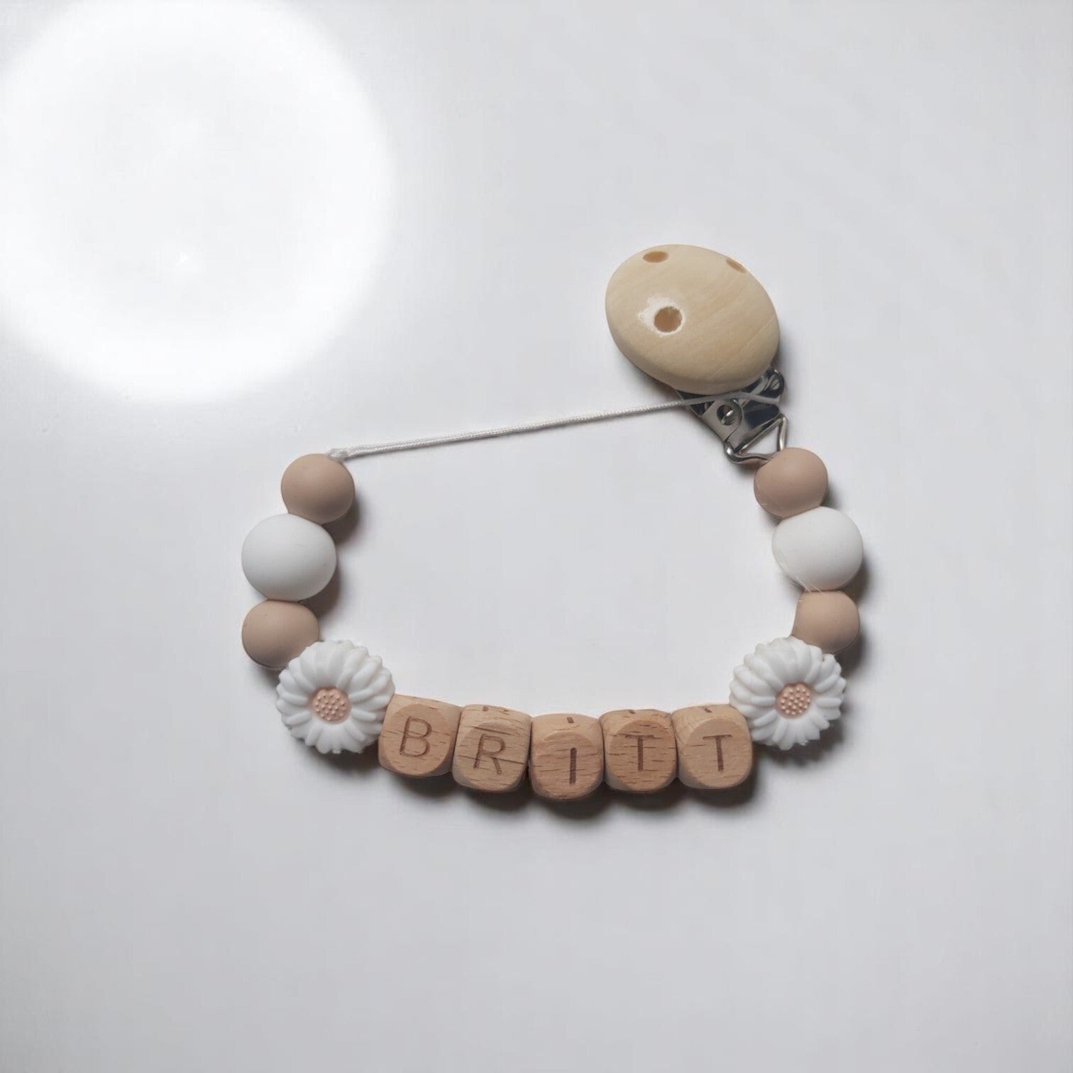 Gepersonaliseerde naam speen koord beige wit bloemetje