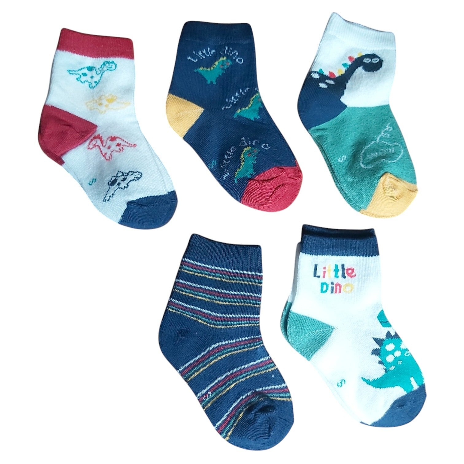 Leuke set van maar liefst 5 paar sokken van de dino serie. Maat 1-2 jaar 80-92. Kleuren wit meerkleurig. 100% polyester.