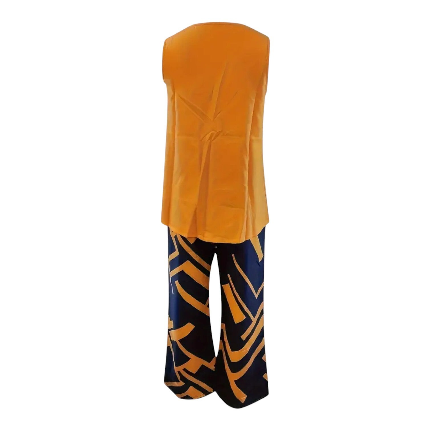 Luchtige zomerset marineblauw oranje. Deze set bestaat uit lange wijde broek met elastische taille band. En mouwloze wijde top effen oranje. De top zie foto heeft 1 haaltje, bij dragen niet opvallend. Foto is ingezoomd! Deze heerlijke set is gemaakt van 100% polyester. Maat XXL afmetingen pkat gemeten top oksel 54cm. lengte 71cm. Broek taille rekbaar 42-60cm. Lengte 102cm.
