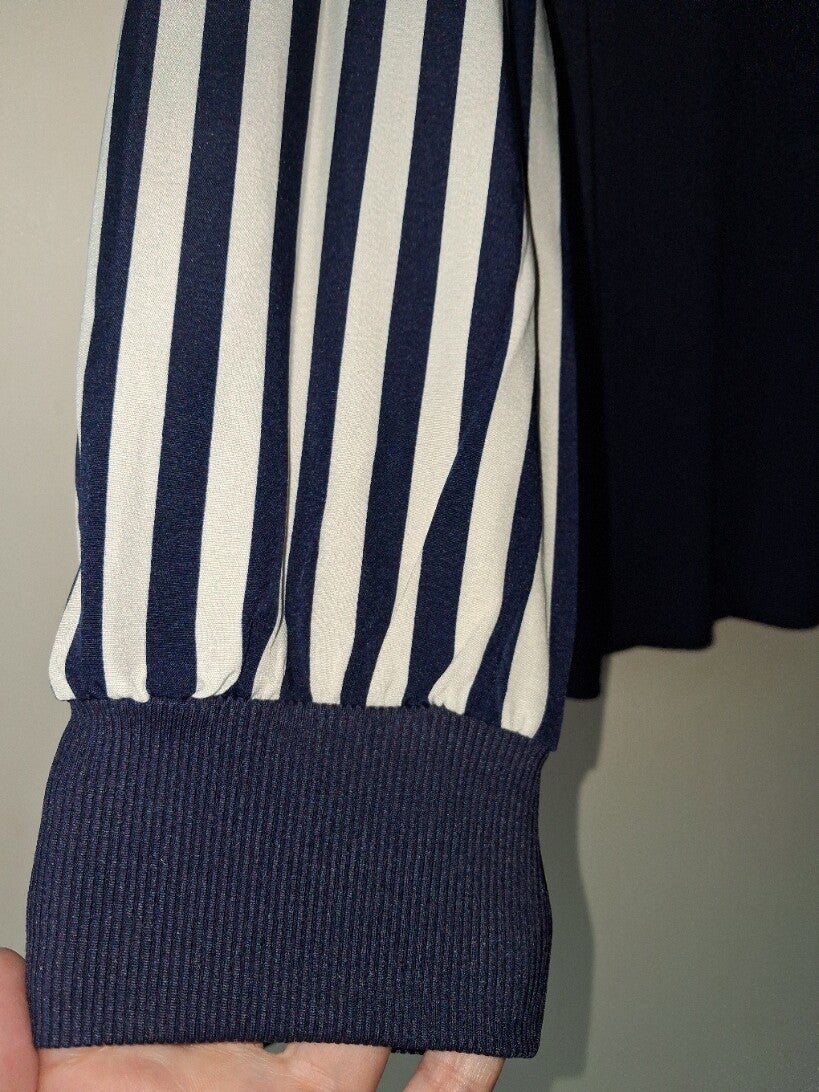Weinig gedragen. Stretch shirt met korte colrand en gestreepte lange mouwen. Kleuren marineblauw wit. Gemaakt van 100% polyester. Maat XL. Afmetingen plat gemeten oksel 50-70cm. schouder 36-50cm lengte 66cm.