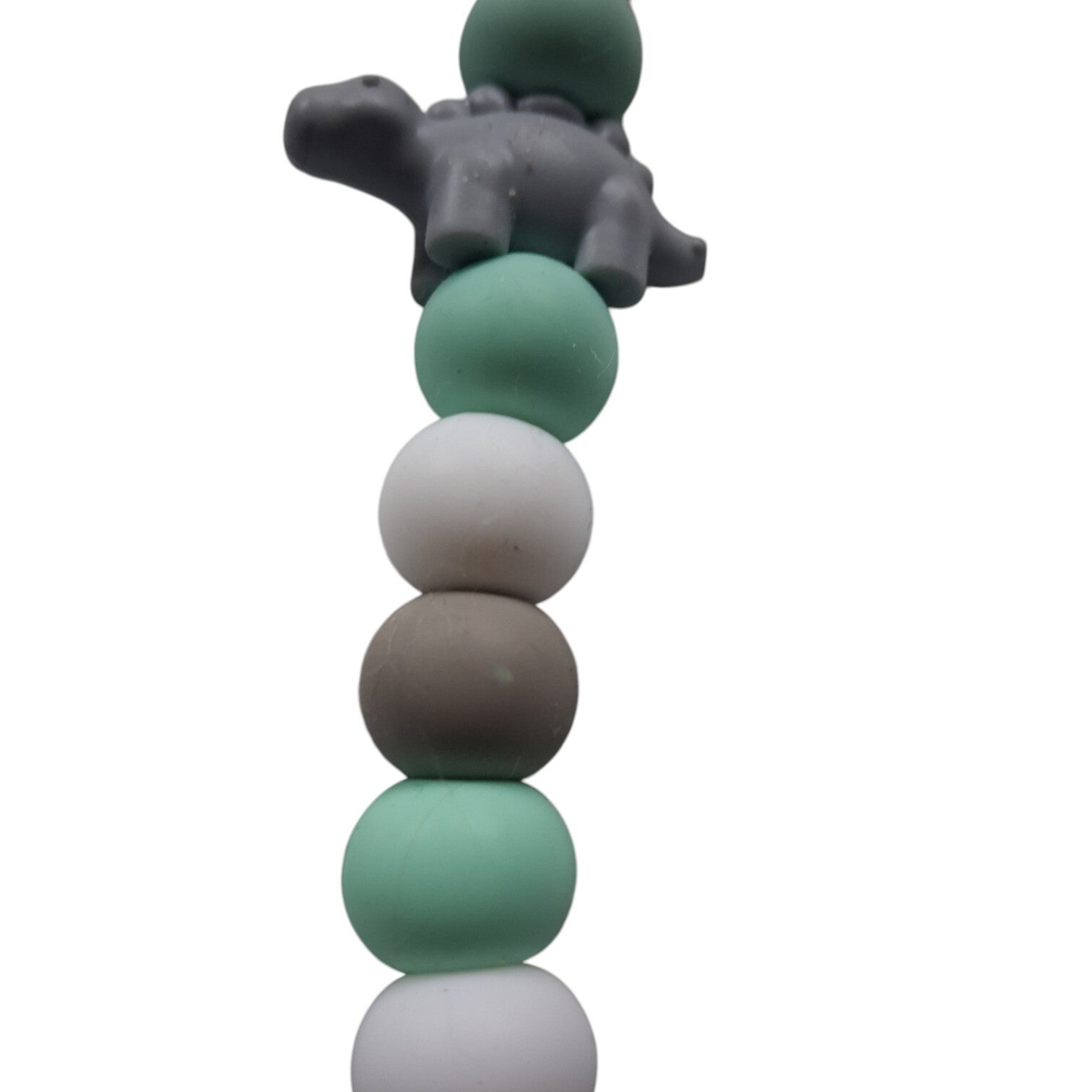 Thema Dino. Speen koord met dino in de kleuren grijs wit en mintgroen. Met deze speenkoord, raakt je kleintje zijn of haar speentje niet meer kwijt. De handige stevige klip is bedoeld voor aan de kledingstukken die je kind draagt, autostoelgordel, kinderwagen. Voor zowel thuis gebruik als voor onderweg. Totale lengte 28cm. Erg leuk om cadeau te geven. Niet geschikt als speelgoed of bijtring. Laat je kleintje nooit alleen ermee. Het speentje kan ook niet meer op de grond vallen. Speenkoorden mogen volgends NEN12586 veiligheidnorm, inclusief lus, zonder clip, maximaal 22 cm lang zijn. - Noekies .com kan niet aansprakelijk worden gesteld voor enige schade, letsel of ongelukken die voortvloeien uit het gebruik van dit speenkoord, zowel direct als indirect. Een speenkoord Is niet bedoeld om op te bijten. Het gebruik van een speenkoord is op eigen verantwoordelijkheid.
