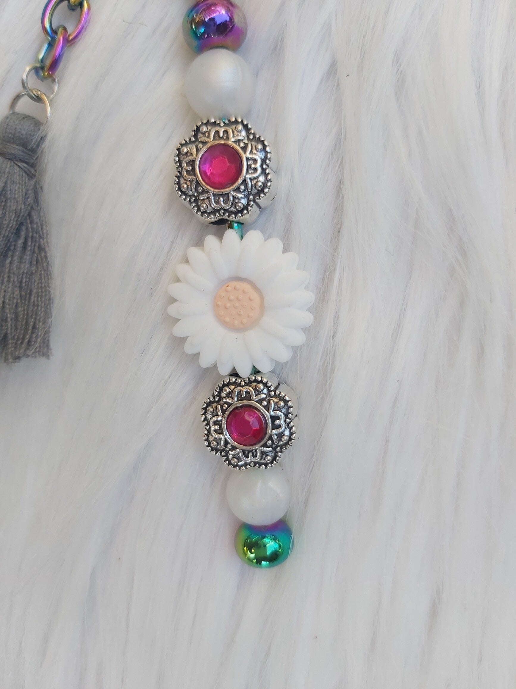 Sleutelhanger - tashanger in metallic kleuren en de sierlijke kralen zijn in de kleuren roze zilver met zilverkleurige kralen en wit bloemetje. Deze sleutelhanger - tashanger kan je gebruiken voor je sleutel, of om je tas mee op te pimpen. Ook is dit een uniek cadeau om weg te geven aan je moeder, dochter, zus, nichtje, oma, vriendin. Lengte 8cm.