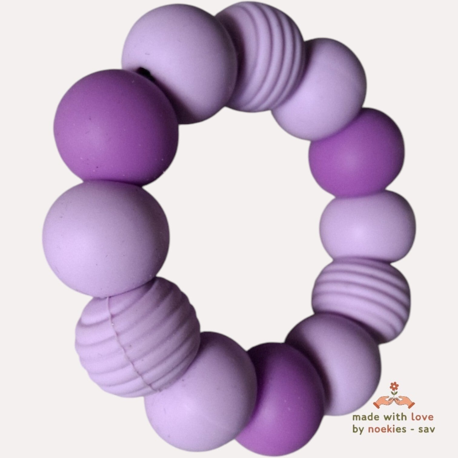 Handgemaakt. Kleuren lila paars. Wanneer je baby tandjes krijgttussen de 4 en 7 maanden, zorgt dit vaak voor pijn en ongemak bij je baby. Het is een nieuw en onprettig gevoel waaraan hij of zij moet wennen. Sabbelen en bijten op een bijtring kan hem of haar hierbij helpen. De tegendruk die dit op zijn tandvlees geeft, verlicht de pijn. Ook kan een bijtring ervoor zorgen dat de tanden sneller doorkomen. Noekies .com kan niet aansprakelijk worden gesteld voor enige schade, letsel of ongelukken die voortvloeien uit het gebruik van de artikelen.