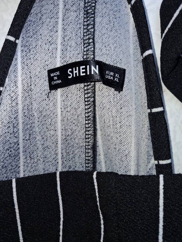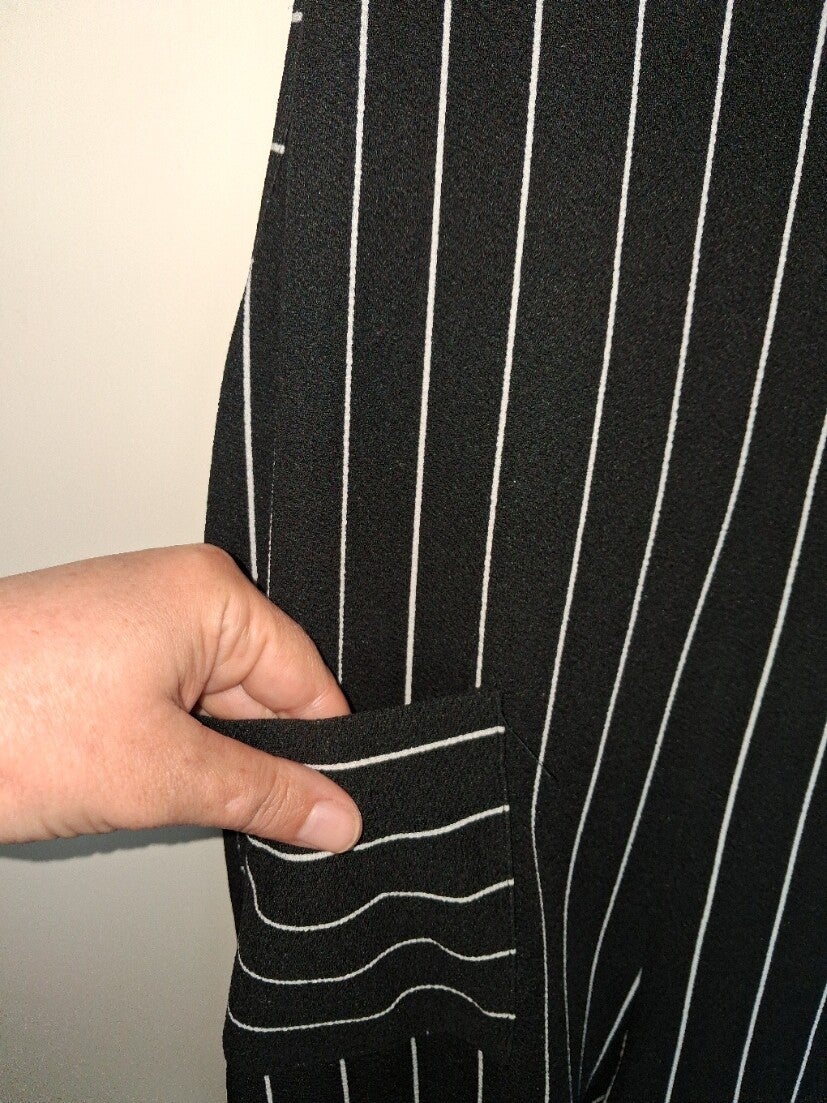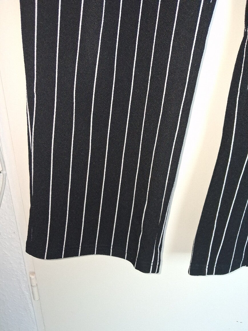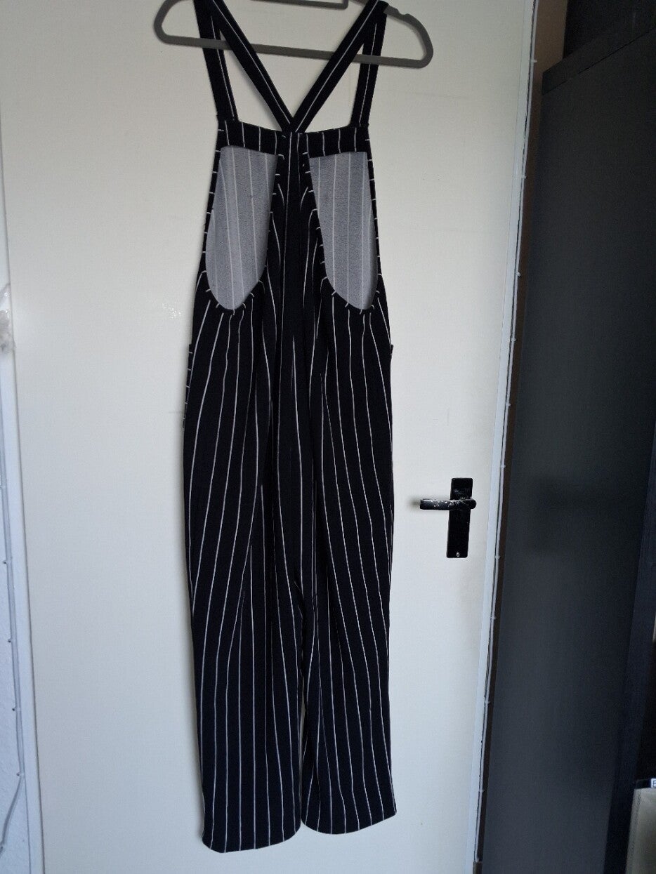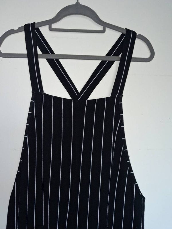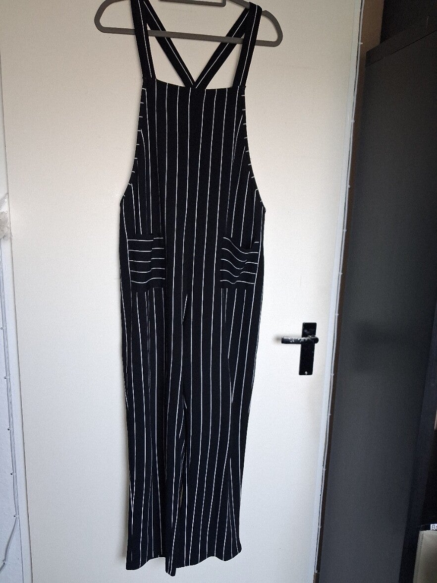 Deze jumpsuit heeft een klassiek zwart-wit gestreept patroon en een wijde pasvorm. De bandjes kruisen op de rug en er zijn twee opgestikte zakken aan de voorkant. De broekspijpen zijn wijd recht model. maat XL met 1 bijna niet zichtbaar vlekje zie foto. Merk Shein