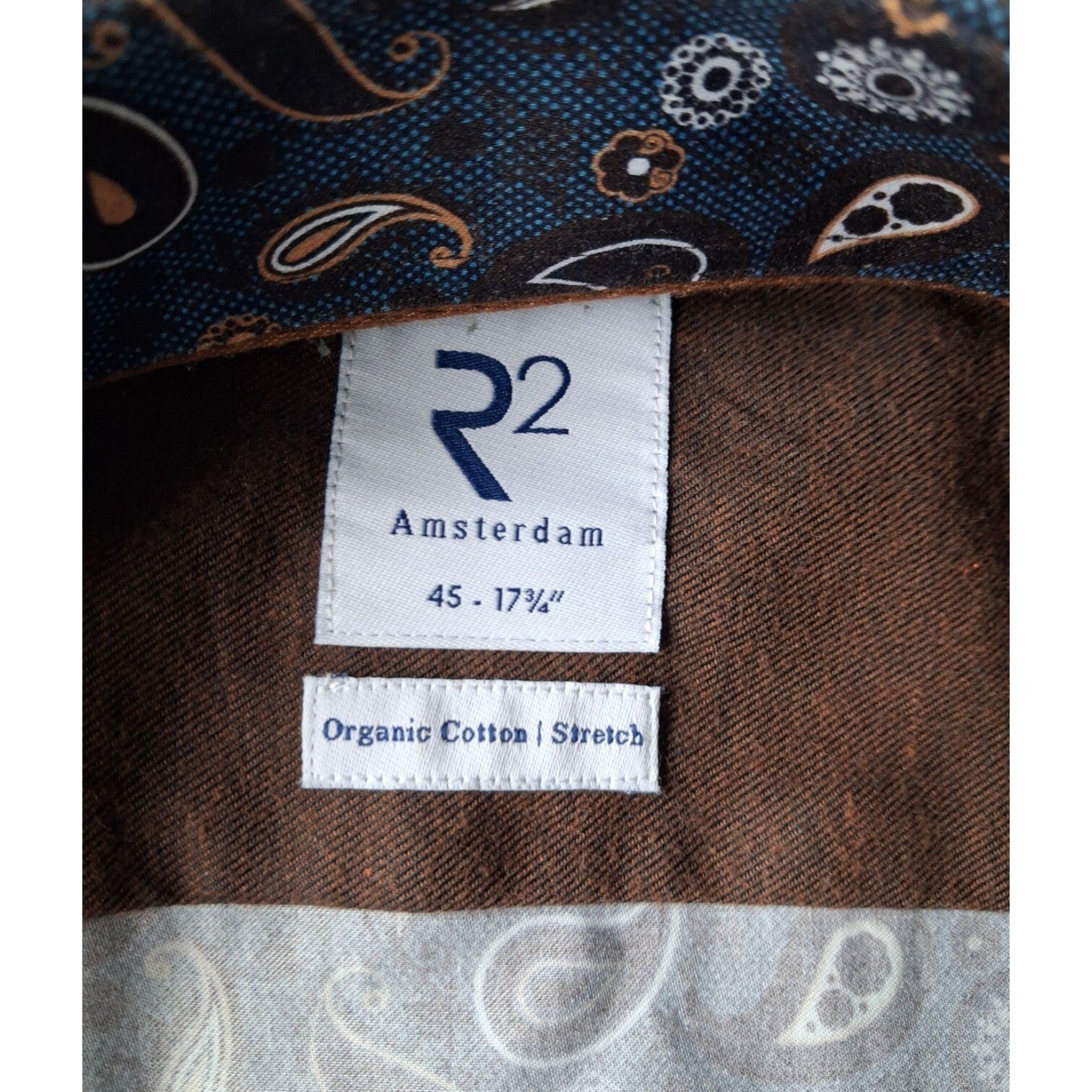 Weinig gedragen. Mooi print overhemd marineblauw met lange mouwen, zonder borstzakje. Maat 45. oksel 67cm schouder 49cm lengte 83cm. Merk R2 Amsterdam.