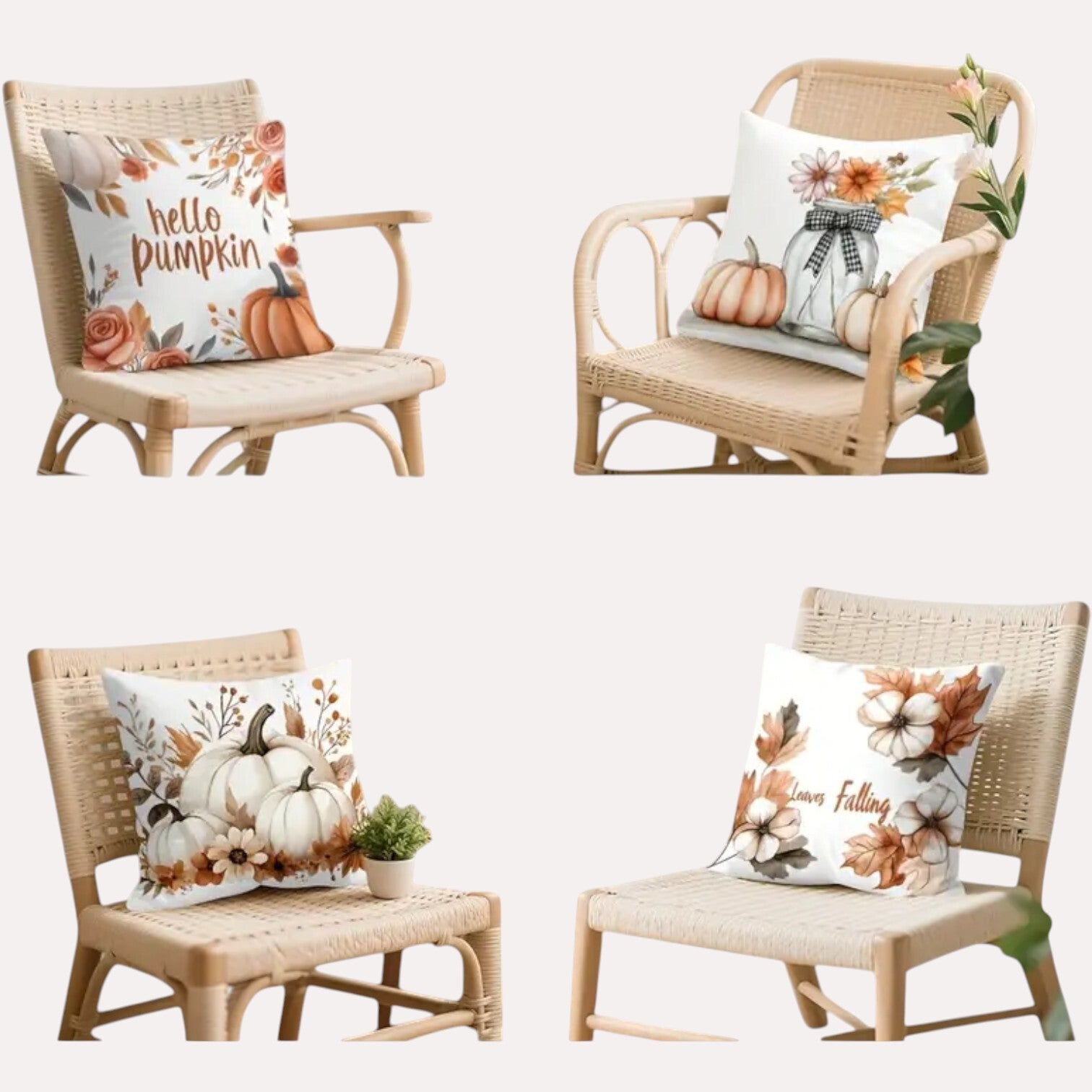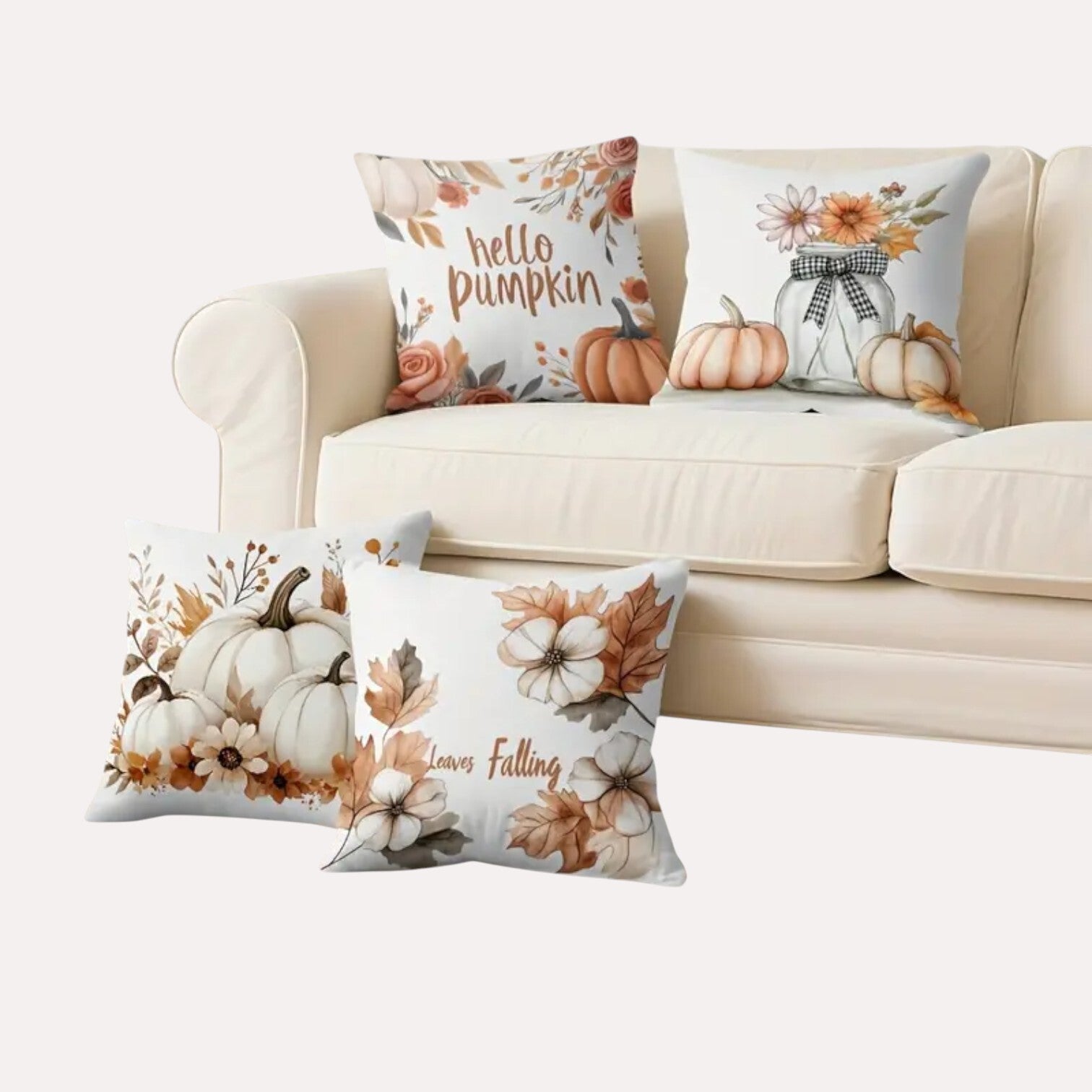 Mooie kussenhoezen met pompoenen print en tekst in bruin oranje kleuren. U ontvangt 4 stuks. De achterzijde van de kussenhoes is effen wit. De kussenhoezen worden zonder kussenvulling geleverd. De kussenhoezen zijn machinewasbaar en hebben en ritssluiting. Afmetingen 45cm x 45cm. 100% polyester.