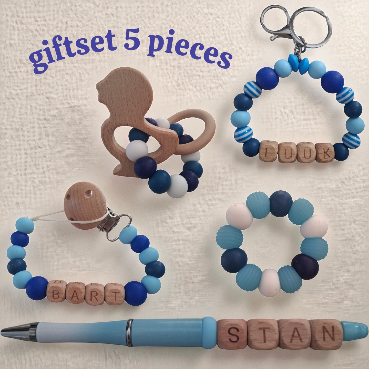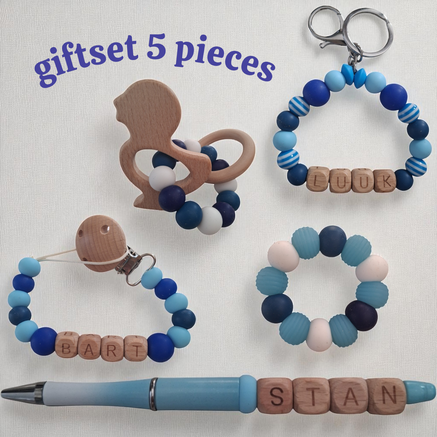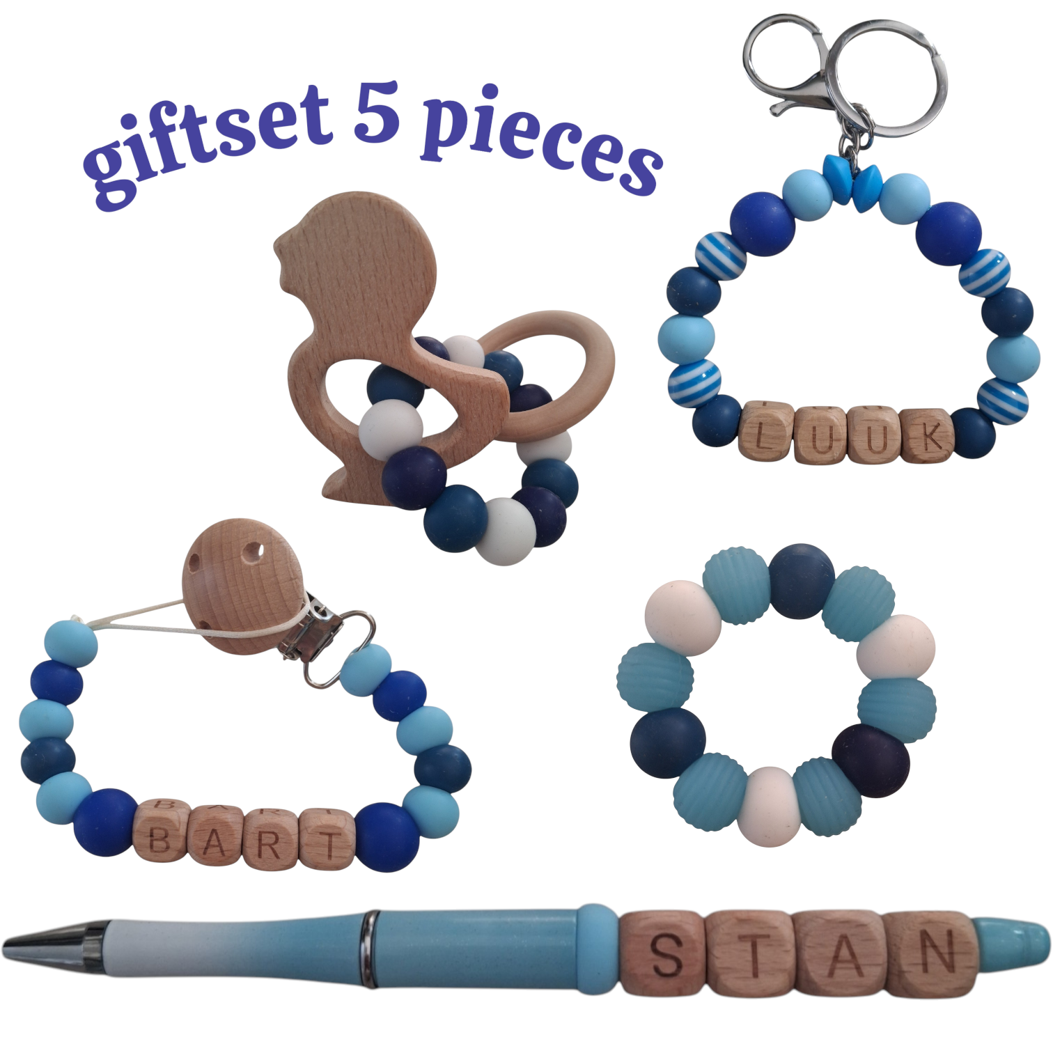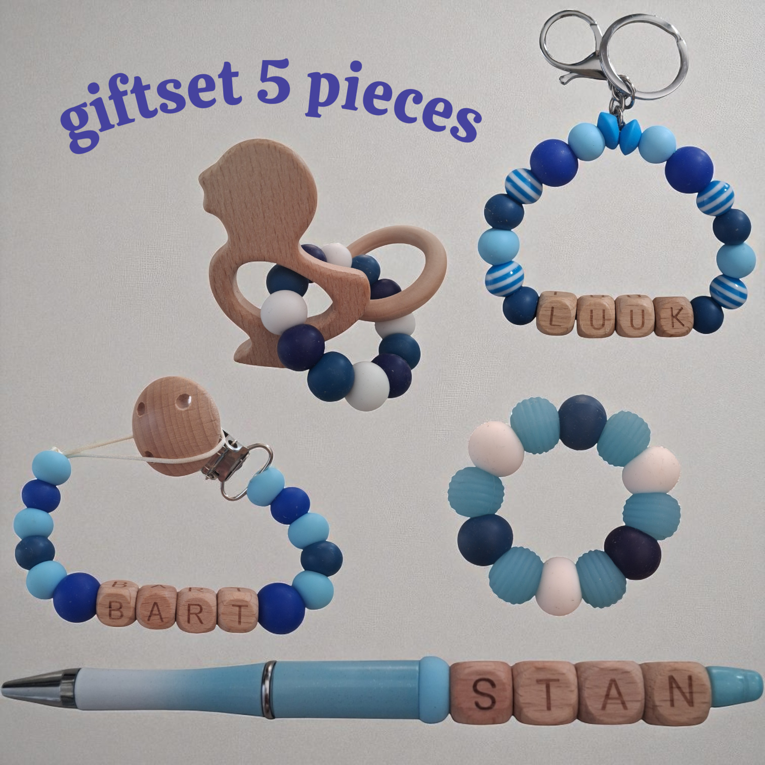 Dit wil elke moeder, een prachtige gepersonaliseerde naam starters set voor moeder en kind. Dus ga jij binnenkort op kraamvisite. of wil je je eigen moeder laten weten, dat ze oma wordt! Of vind je de set te leuk voor jezelf en je baby. Alle artikelen worden handgemaakt. Thema blauw eend. Gepersonaliseerd met eigen gekozen naam. Alle artikelen zijn ook los te bestellen. De kralen zijn volledig BPA-vrij, PVC-vrij, lood-vrij en ftalaat-vrij.