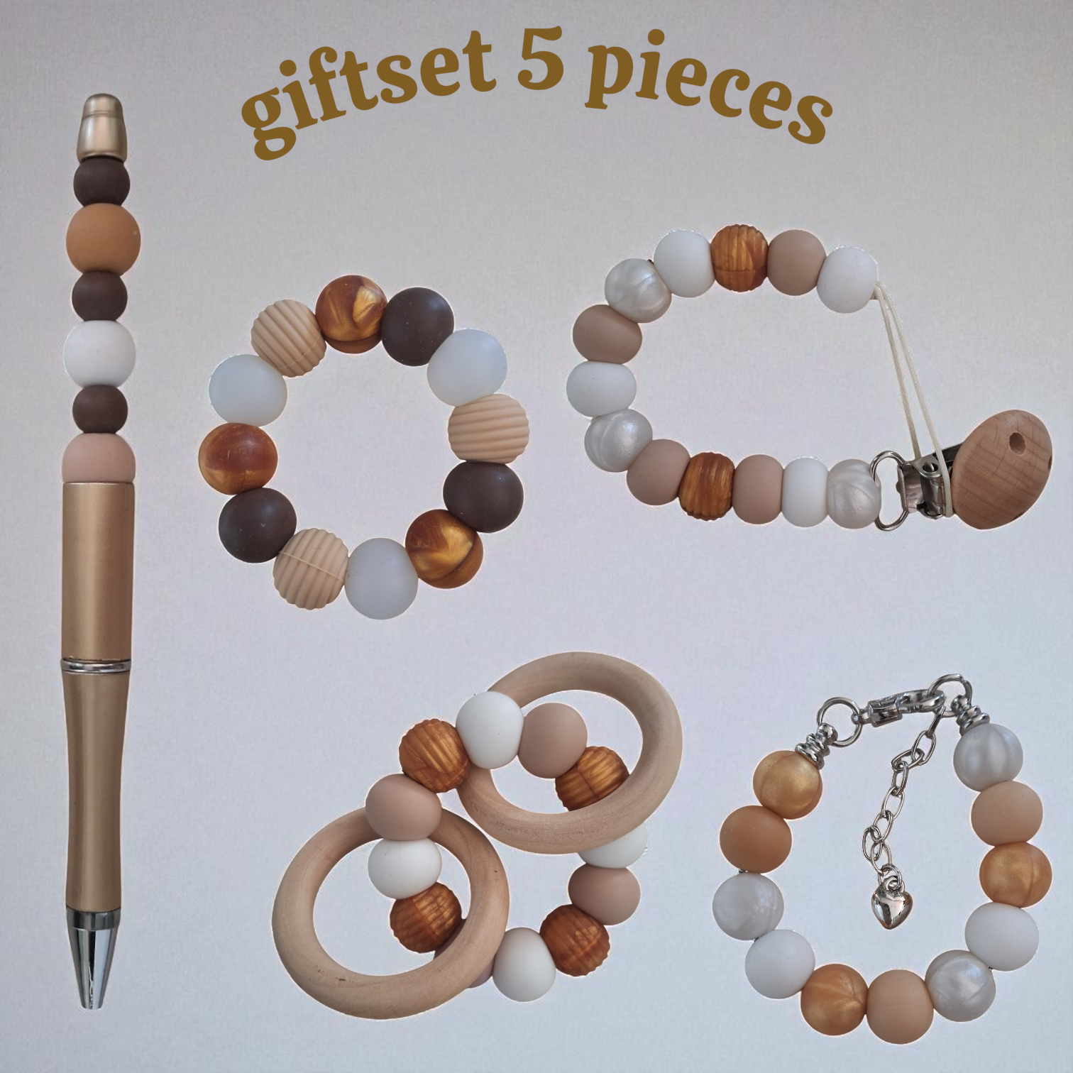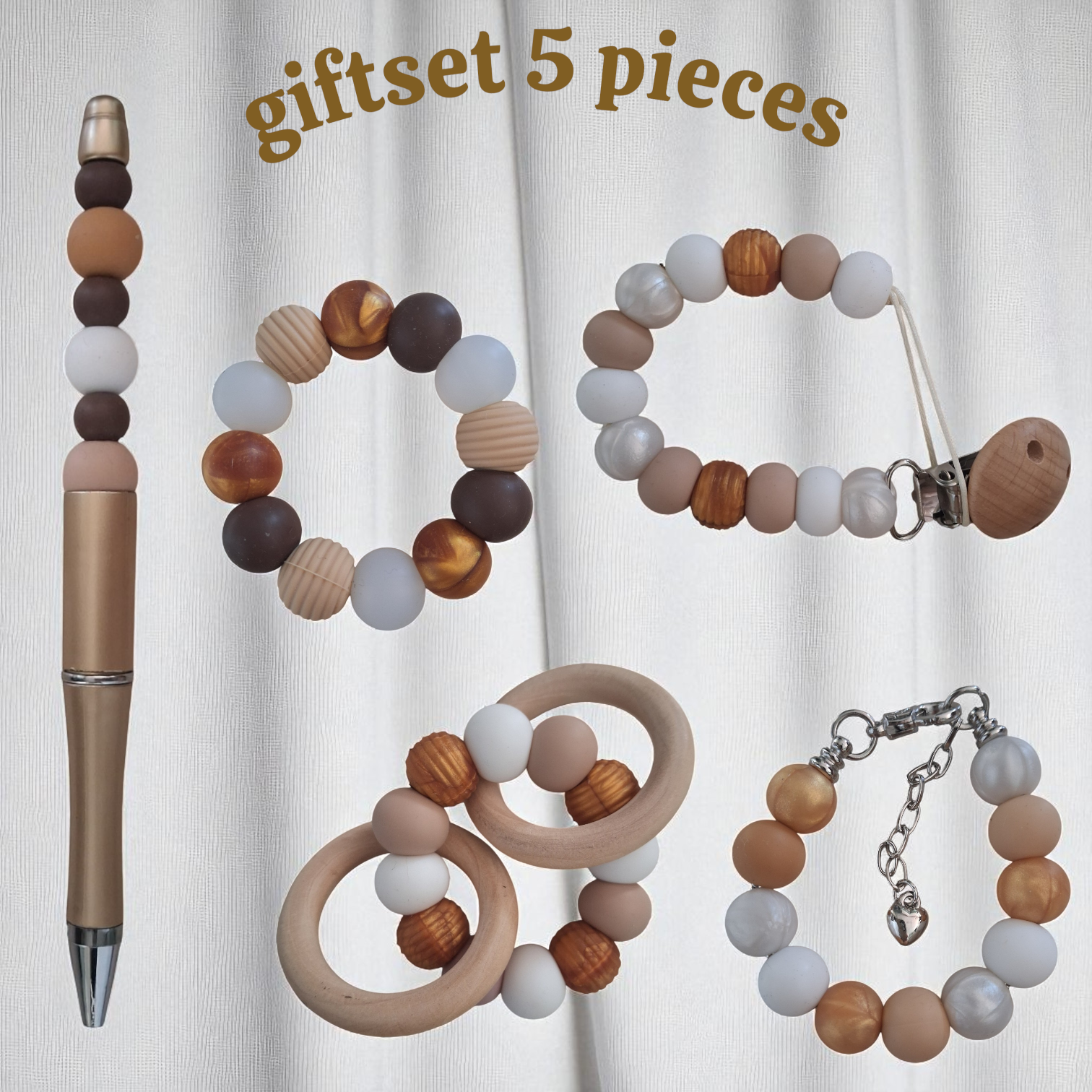 Dit wil elke moeder, een prachtige starters set voor moeder en dochter. Dus ga jij binnenkort op kraamvisite. of wil je je eigen moeder laten weten, dat ze oma wordt! Of vind je de set te leuk voor jezelf en je baby. Alle artikelen worden handgemaakt. Thema wit goud bruin. Alle artikelen zijn ook los te bestellen. De kralen zijn volledig BPA-vrij, PVC-vrij, lood-vrij en ftalaat-vrij.