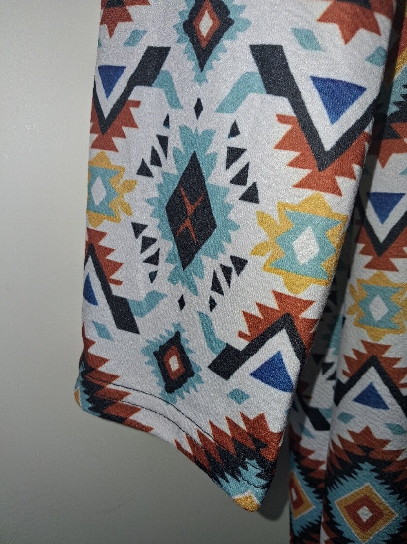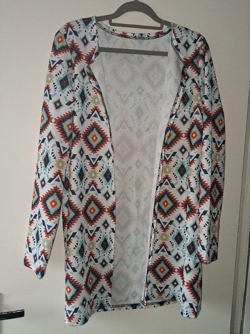Lang stretchy vest met mooie ruit patroon in de kleuren wit lichtlauw bruin. maat XXL. Dit vest is gemaakt van 95% polyester 5% spandex. Lengte 83cm, dit komt overeen met halverwege bovenbeen. Borstomvang: 107-113cm, Taille: 87-93cm, Heupen: 112-118cm. Armlengte gemeten vanaf schouder naad 64cm. Binnen armlengte gemeten vanaf oksel 51cm.
