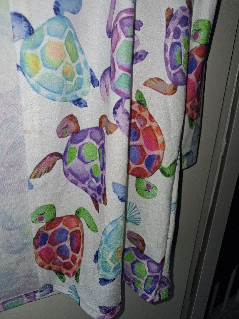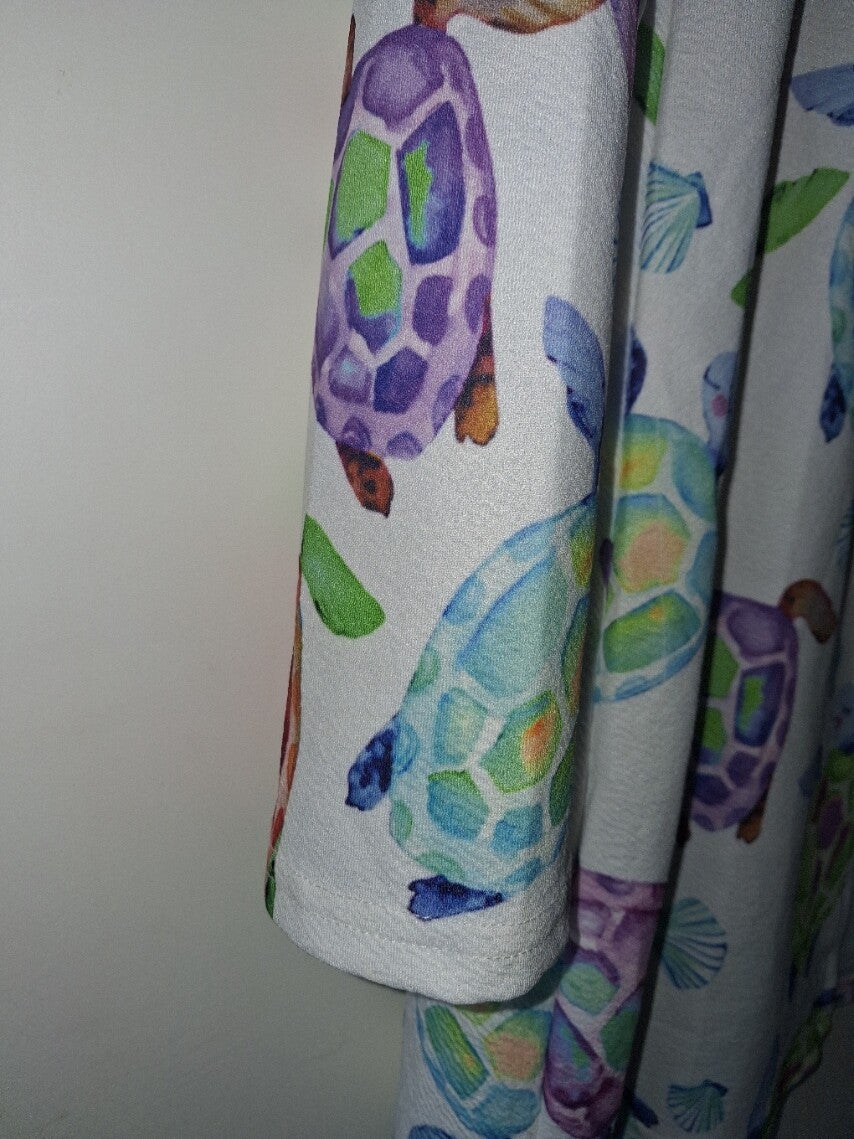 Lang stretchy open vest met mooie schildpadden patroon in de kleuren wit groen blauw paars rood oranje. maat XXL. Dit vest is gemaakt van 95% polyester 5% spandex. Lengte 83cm, dit komt overeen met halverwege bovenbeen. Borstomvang: 107-113cm, Taille: 87-93cm, Heupen: 112-118cm. Armlengte gemeten vanaf schouder naad 64cm. Binnen armlengte gemeten vanaf oksel 51cm.