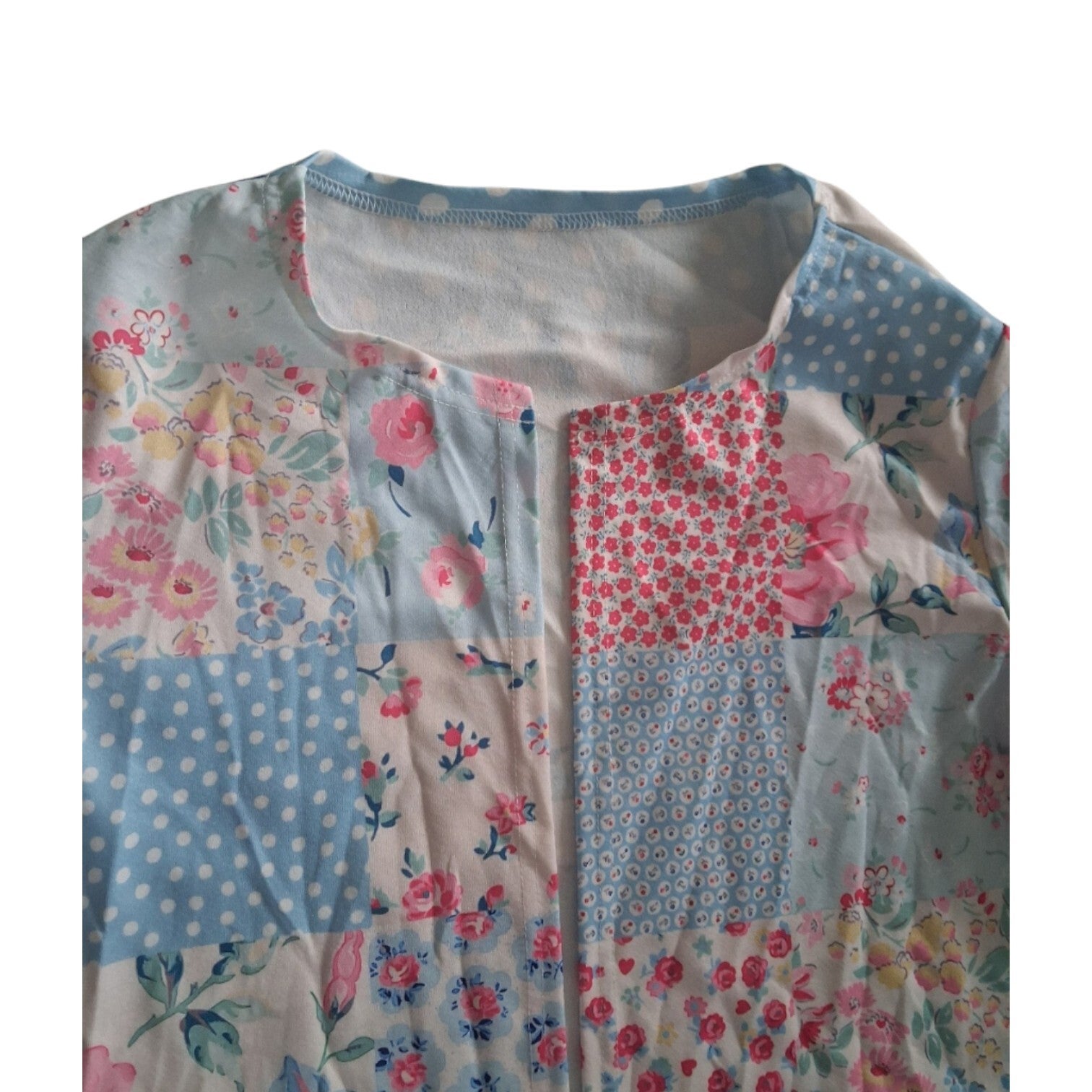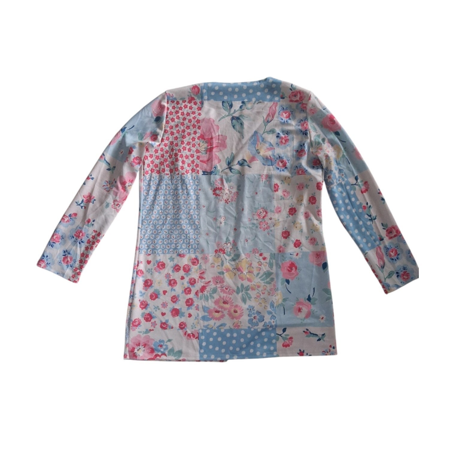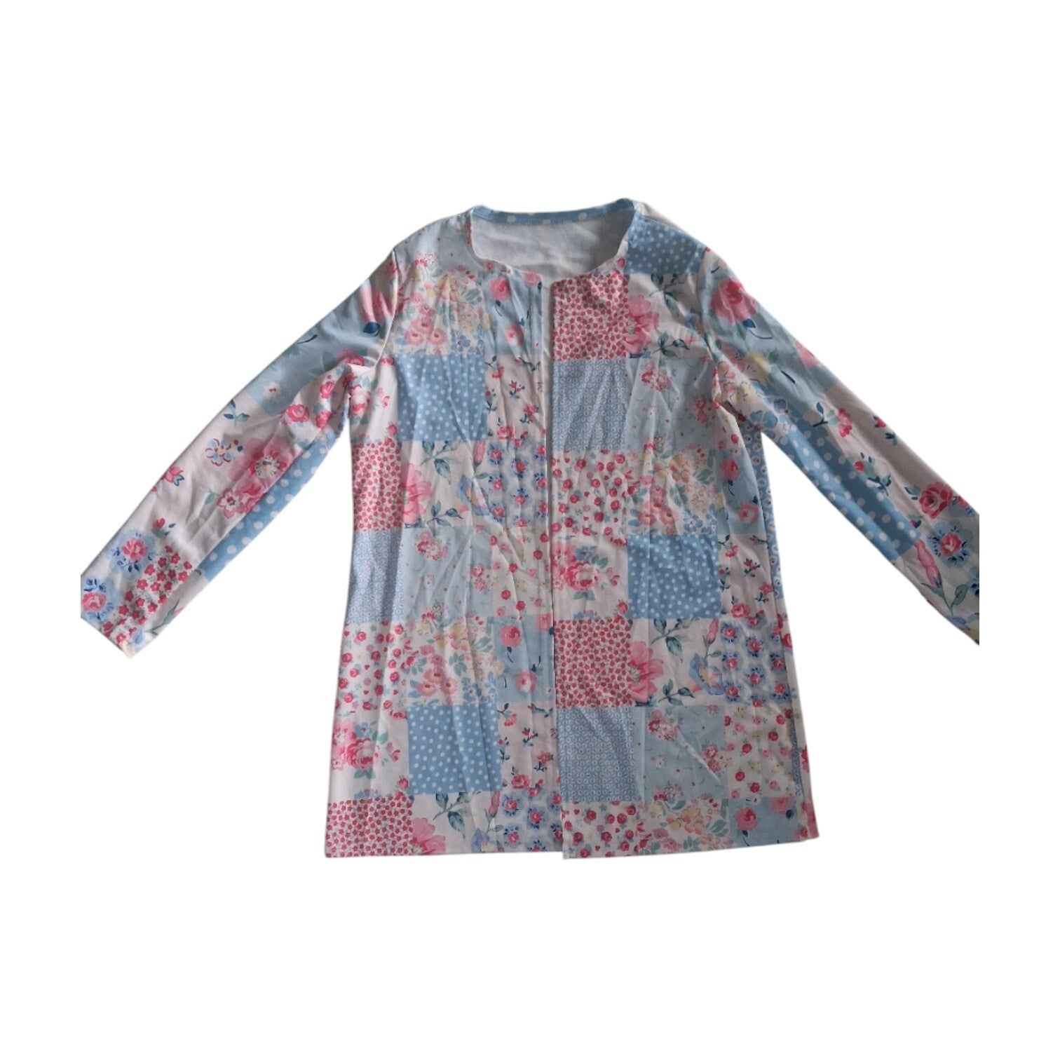 Lang stretchy open vest met mooi patroon met bloemetjes in de kleuren wit lichtblauw roze geel. maat XXL. Dit vest is gemaakt van 95% polyester 5% spandex. Lengte 83cm, dit komt overeen met halverwege bovenbeen. Borstomvang: 107-113cm, Taille: 87-93cm, Heupen: 112-118cm. Armlengte gemeten vanaf schouder naad 64cm. Binnen armlengte gemeten vanaf oksel 51cm.