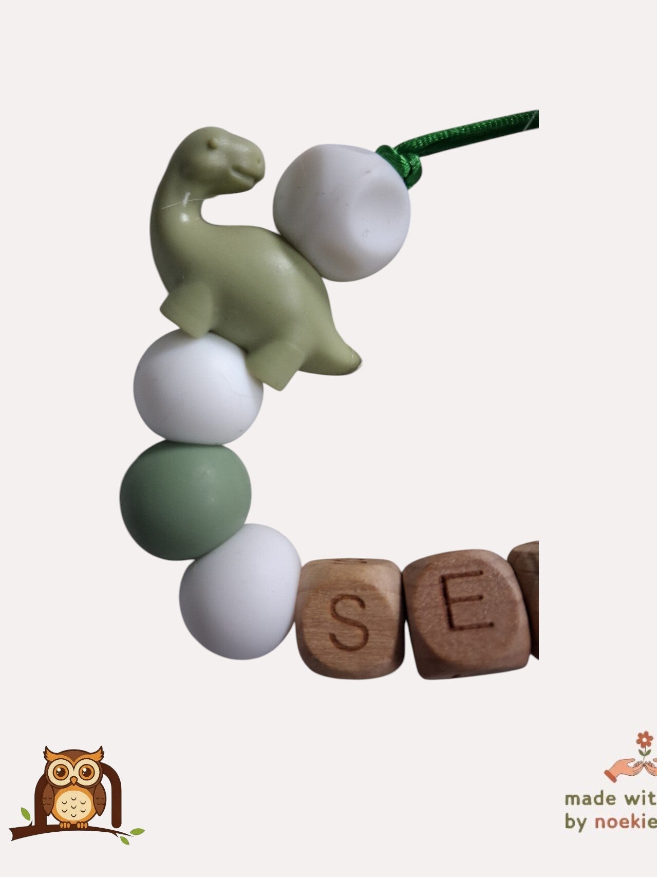 Handgemaakt. Welke naam is voor jou wondertje? De siliconen kralen zijn een mix van wit en khaki groene kleuren met vrolijk dino langnek. De letterkralen zijn van beukenhout. De kralen zijn volledig BPA-vrij, PVC-vrij, lood-vrij en ftalaat-vrij. Met deze op naam gemaakte speenkoord, raakt je kleintje zijn of haar speentje niet meer kwijt. De handige stevige klip is bedoeld voor aan de kledingstukken die je kind draagt, autostoelgordel, kinderwagen. Voor zowel thuis gebruik als voor onderweg. Erg leuk om cadeau te geven. Niet geschikt als speelgoed of bijtring. Laat je kleintje nooit alleen ermee. Nooit meer het favoriete speentje kwijtraken door zo'n handig speenkoord. Het speentje kan ook niet meer op de grond vallen. Hygiënisch, hip en gepersonaliseerd met naam! Als de naam langer dan 5 letters is (max 9 letters) kan er een aanpassing aan het speenkoord gemaakt worden. Speenkoorden mogen volgends NEN12586 veiligheidnorm, inclusief lus, zonder clip, maximaal 22 cm lang zijn. Noekies .com kan niet aansprakelijk worden gesteld voor enige schade, letsel of ongelukken die voortvloeien uit het gebruik van dit speenkoord, zowel direct als indirect. Een speenkoord Is niet bedoeld om op te bijten. Het gebruik van een speenkoord is op eigen verantwoordelijkheid.