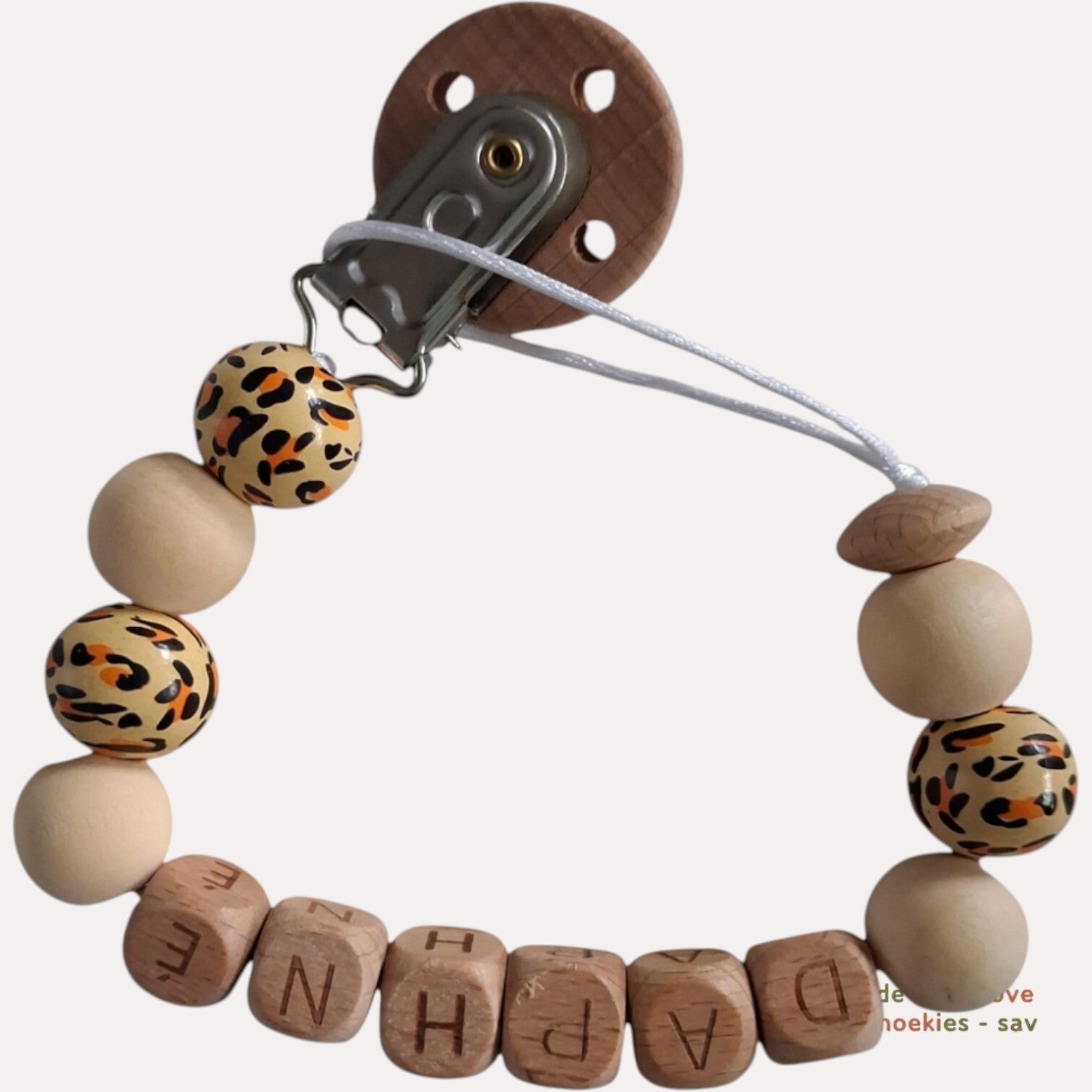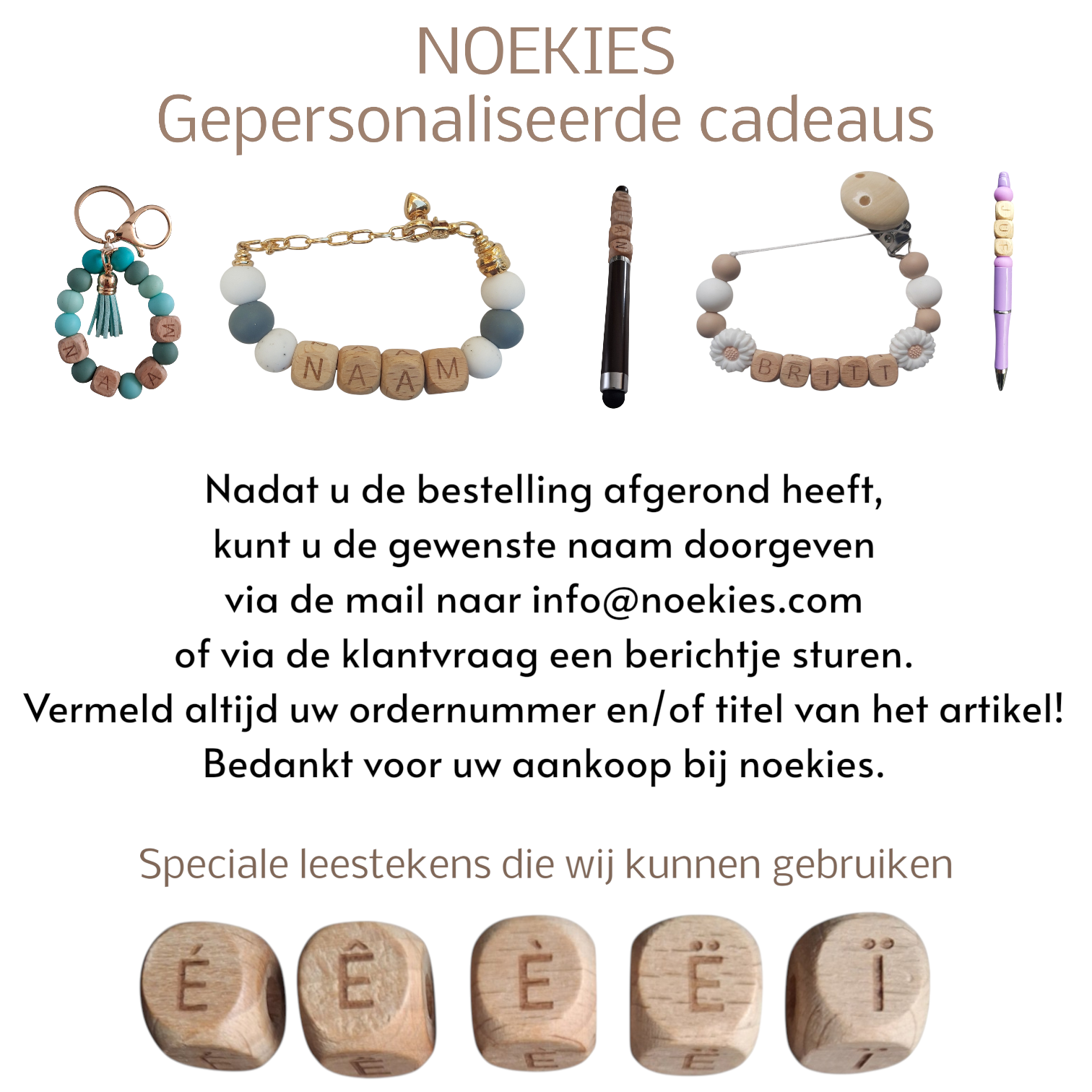 Handgemaakt. Welke naam is voor jou wondertje? Nadat de bestelling voltooid is , ontvangt u een berichtje van mij, welke naam u wenst. En gaan we met liefde aan de slag! De kralen zijn een mix van van hout en sillecone met panterprint in beige bruine kleuren. De letterkralen zijn van beukenhout. De kralen zijn volledig BPA-vrij, PVC-vrij, lood-vrij en ftalaat-vrij. Met deze op naam gemaakte speenkoord, raakt je kleintje zijn of haar speentje niet meer kwijt. De handige stevige klip is bedoeld voor aan de kledingstukken die je kind draagt, autostoelgordel, kinderwagen. Voor zowel thuis gebruik als voor onderweg. Erg leuk om cadeau te geven. Niet geschikt als speelgoed of bijtring. Laat je kleintje nooit alleen ermee. Nooit meer het favoriete speentje kwijtraken door zo'n handig speenkoord. Het speentje kan ook niet meer op de grond vallen. Hygiënisch, hip en gepersonaliseerd met naam! Als de naam langer dan 5 letters is (max 9 letters) kan er een aanpassing aan het speenkoord gemaakt worden. Speenkoorden mogen volgends NEN12586 veiligheidnorm, inclusief lus, zonder clip, maximaal 22 cm lang zijn. Noekies .com kan niet aansprakelijk worden gesteld voor enige schade, letsel of ongelukken die voortvloeien uit het gebruik van dit speenkoord, zowel direct als indirect. Een speenkoord Is niet bedoeld om op te bijten. Het gebruik van een speenkoord is op eigen verantwoordelijkheid.