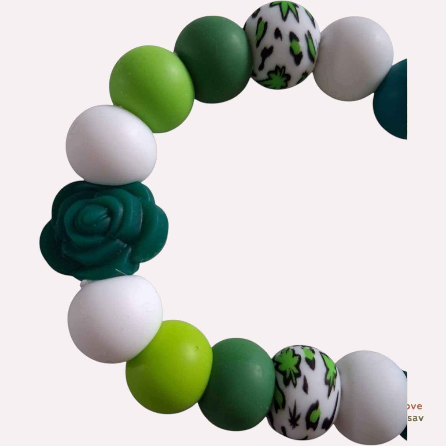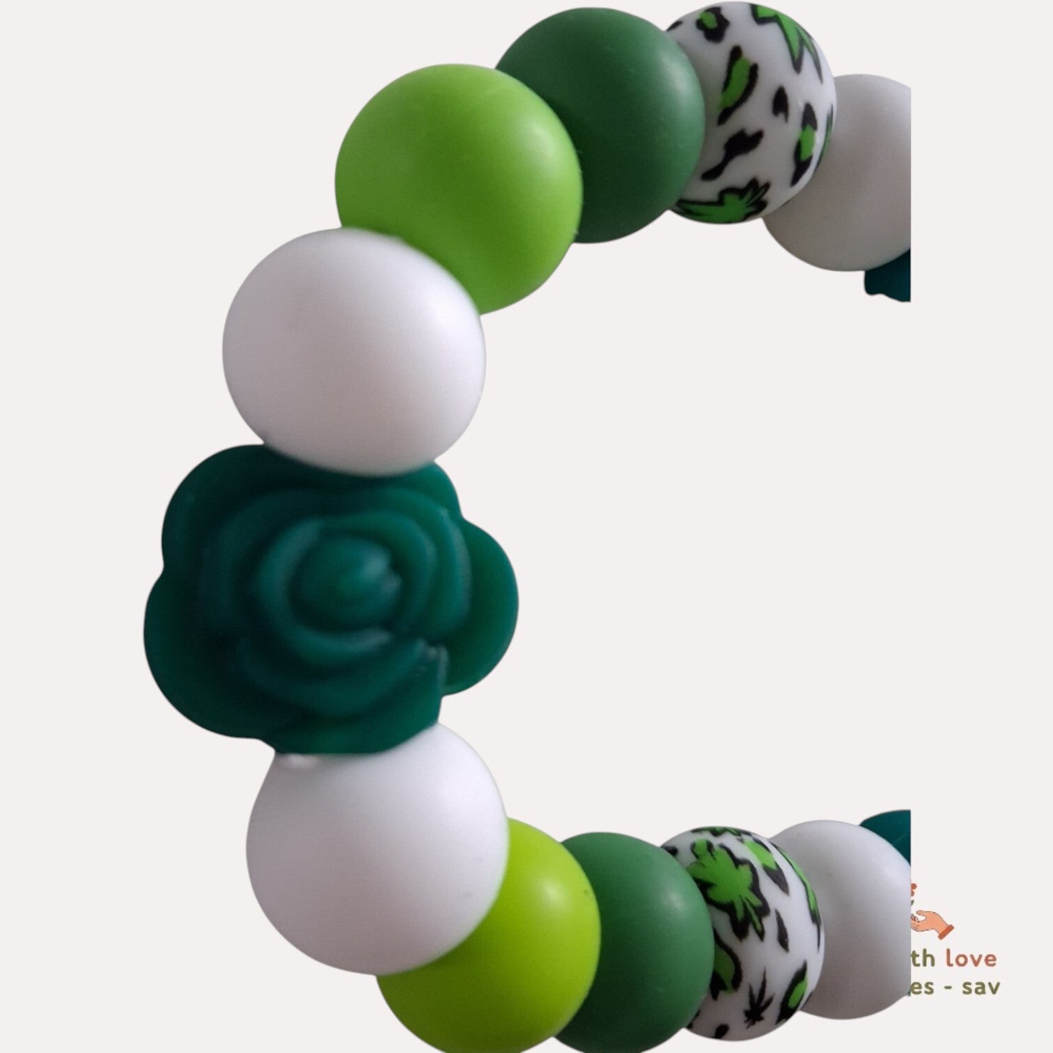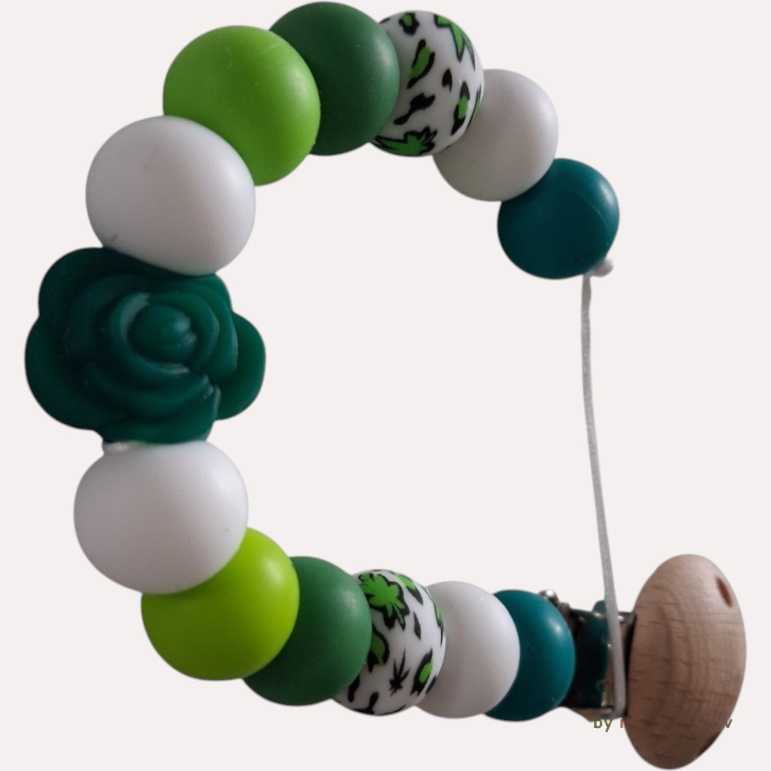 Handgemaakt. Thema roos. Speenkoord met roosje in de kleuren groen appelgroen en wit. Met deze speenkoord, raakt je kleintje zijn of haar speentje niet meer kwijt. De handige stevige klip is bedoeld voor aan de kledingstukken die je kind draagt, autostoelgordel, kinderwagen. Voor zowel thuis gebruik als voor onderweg. Totale lengte 28cm. Erg leuk om cadeau te geven. Niet geschikt als speelgoed of bijtring. Laat je kleintje nooit alleen ermee. Het speentje kan ook niet meer op de grond vallen. Speenkoorden mogen volgends NEN12586 veiligheidnorm, inclusief lus, zonder clip, maximaal 22 cm lang zijn. - Noekies .com kan niet aansprakelijk worden gesteld voor enige schade, letsel of ongelukken die voortvloeien uit het gebruik van dit speenkoord, zowel direct als indirect. Een speenkoord Is niet bedoeld om op te bijten. Het gebruik van een speenkoord is op eigen verantwoordelijkheid.