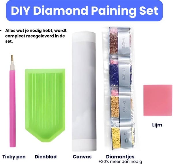 - Compleet Pakket: Inclusief canvas met plaklaag, steentjes, pen en wax – alles wat je nodig hebt om direct te beginnen.