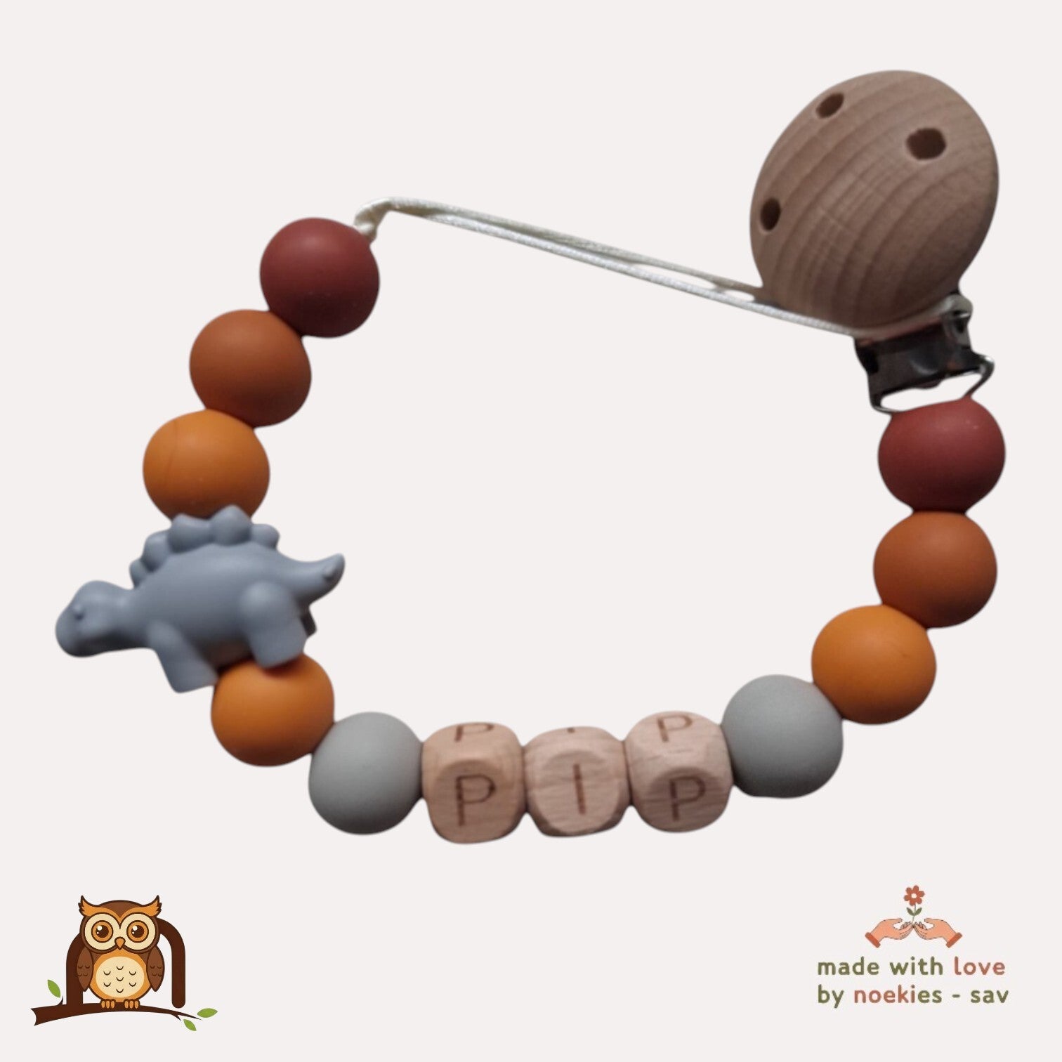 nr 4 noekies naam speenkoord dino grijs oranje